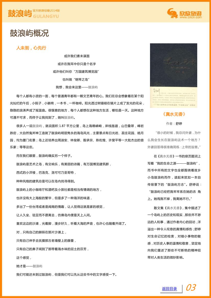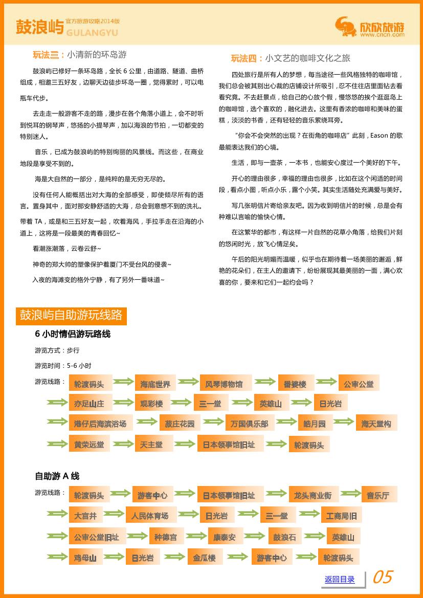 因海西南有海蚀洞受浪潮冲击,声如擂鼓,明朝雅化为今名。由于历史原因,中外风格各异的建筑物在此地被完好地汇集、保留,不仅有“万国建筑博览”之称。小岛还是音乐的沃土,人才辈出,钢琴拥有密度居全国之冠,又得美名“钢琴之岛”、“音乐之乡”。鼓浪屿就是这样具有小资情调的岛,面朝大海、春暖花开。 本攻略详细介绍了鼓浪屿游、吃、住、线路等丰富的实用信息,相信对您的出行很有帮助噢!赶快免费下载吧!