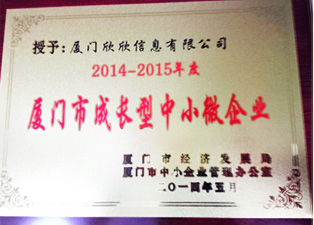 2013年11月 荣获“2014-2015厦门市成长型中小企业”