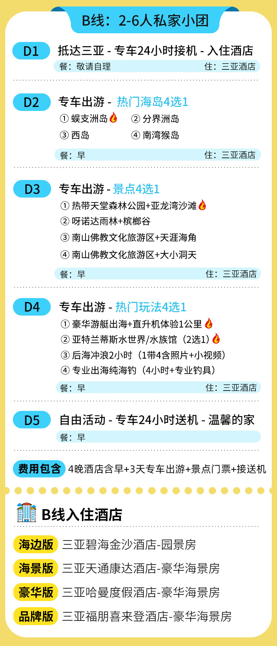 3、海南常年旺季,所以不指定酒店和房型,若主选酒店无房情况下,安排备选酒店入住!