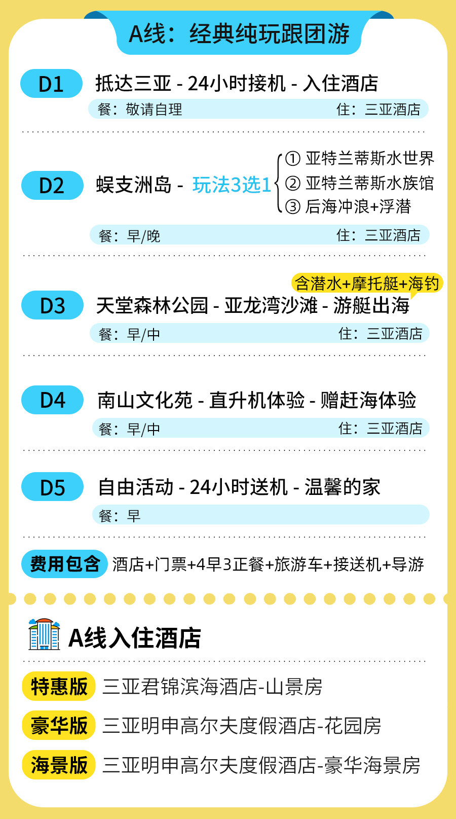 A线用餐说明:含3正4早,早餐为自助,正餐30元/人:疍家蒸汽海鲜火锅、水果宴、海南本地菜