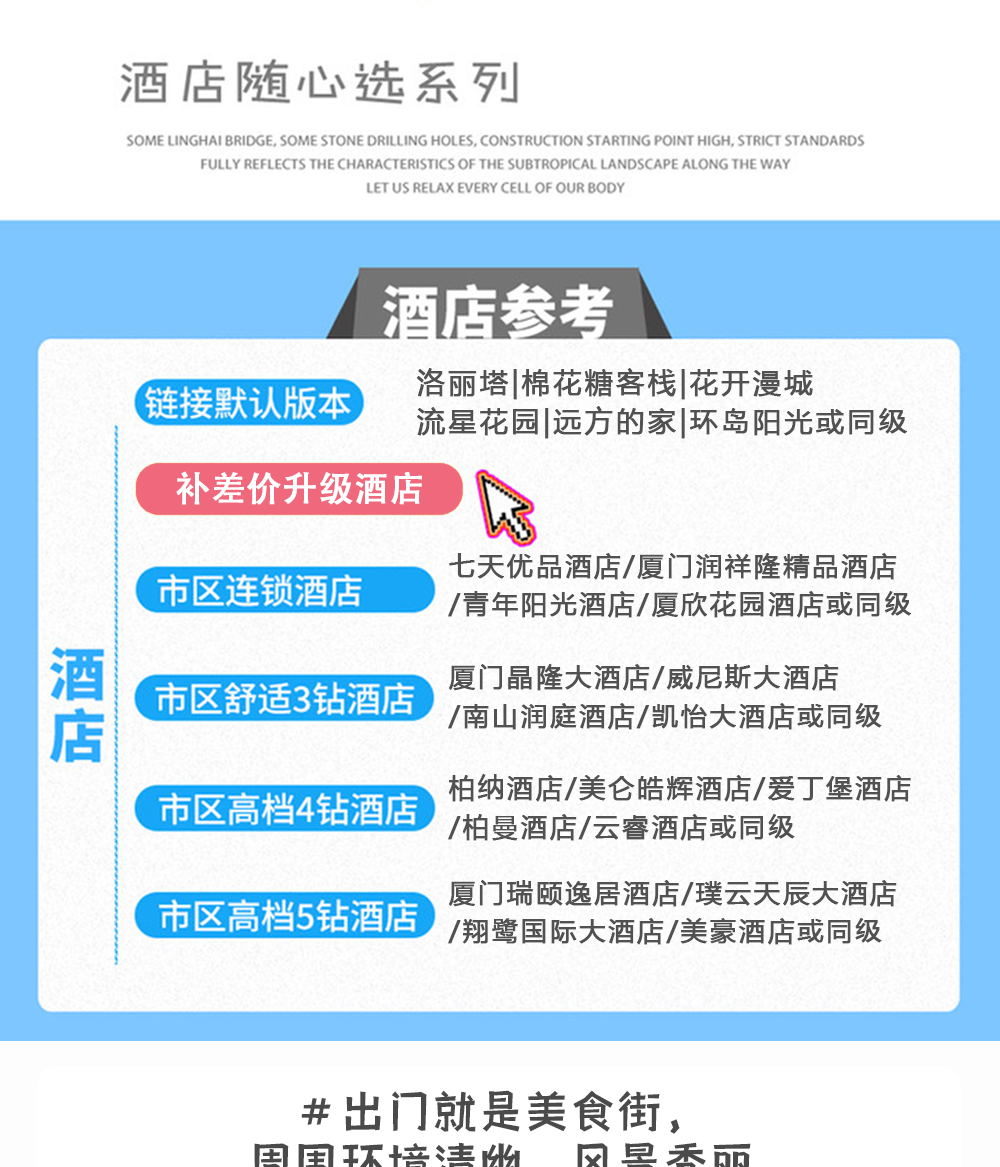 【参考住宿】棉花堂,花开漫城,洛丽塔,远方的家,流星花园,环岛阳光,白鹭苑,归来小息,艾尚97客栈,仲夏之夜,环岛阳光客栈,黄金厝客栈等及同等级客栈。餐食行程中所列餐食(飞机餐是否收费请参照航空公司规定)4早,2正餐
