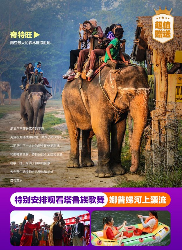 【全国联运】尼泊尔+加德满都+奇特旺+博卡拉+纳加阔特8天7晚跟团游(塔鲁族歌舞+骑大象+戴维瀑布+萨朗阔特日出+猴庙+高档酒店)