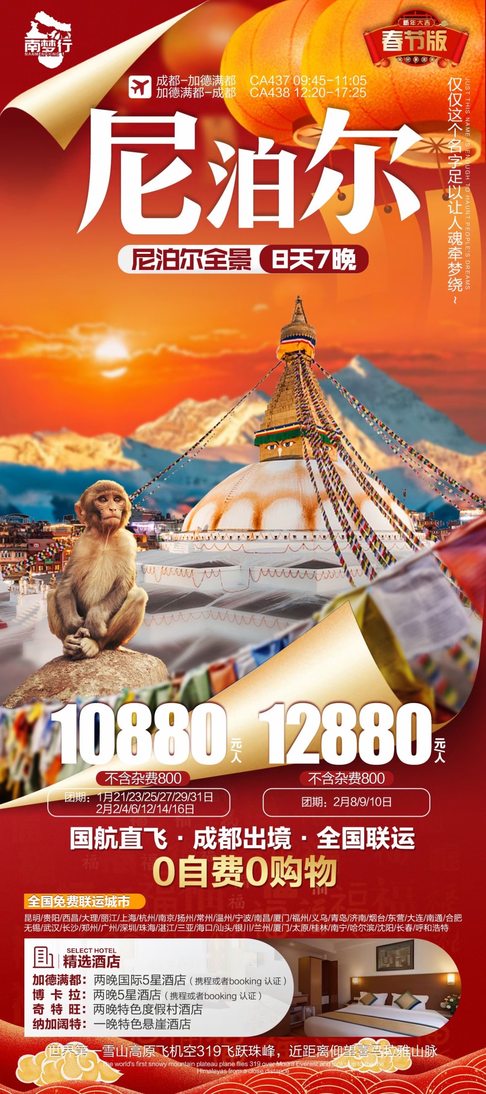 郑州去尼泊尔旅游请选好参团日期,并来电询问最早团期,旺季期间价格可能会稍有变动,具体价格以来电咨询为准!