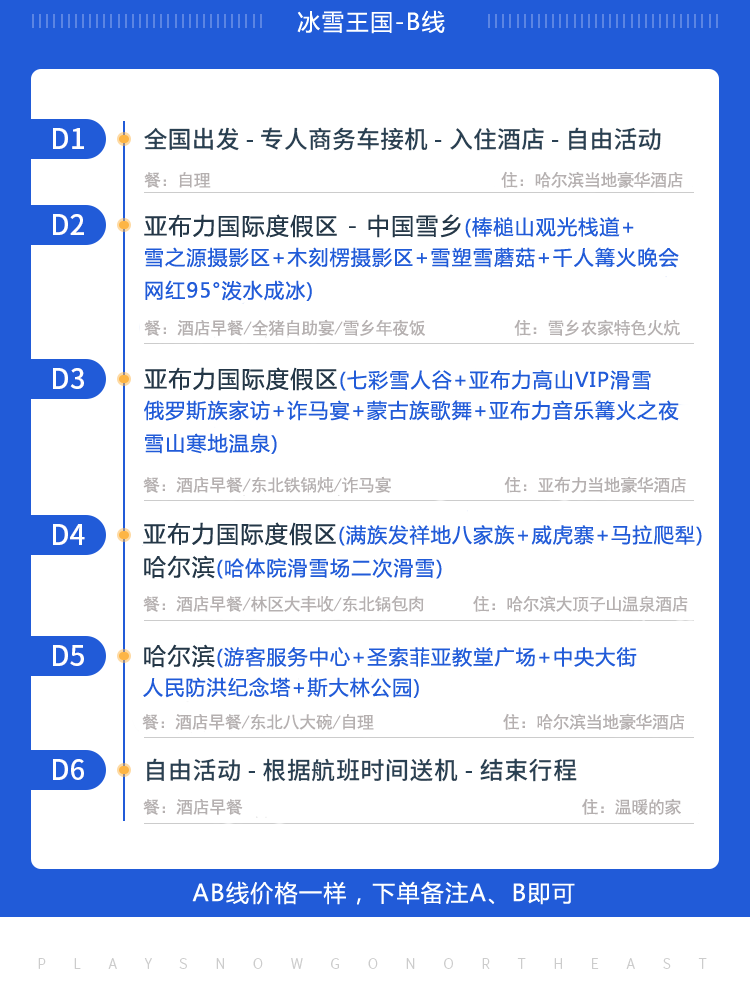 2、住宿标准:全程入住指定备选酒店(标间,住房含早餐,不用不退)。本品按双人共用一间房核算的单人价格,不接受目的地拼房,如您是单人出行或需单人包房,请报名时直接补齐包房房差,三人间为标准间加床处理。