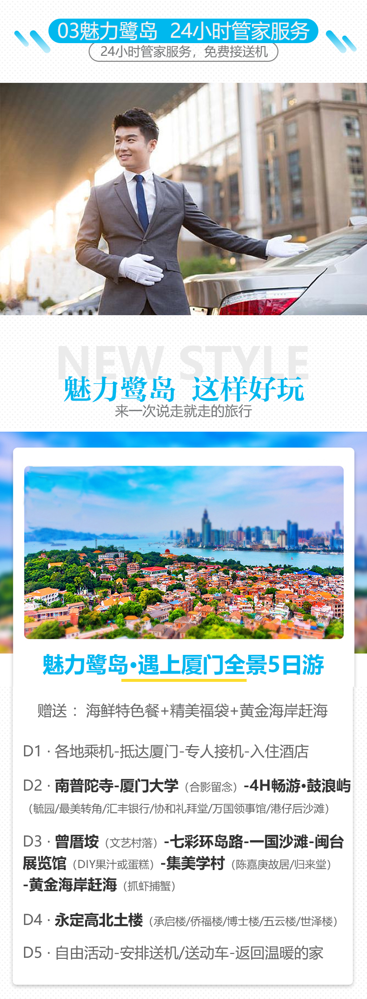 【探寻高北土楼】厦门+龙岩+鼓浪屿5天4晚跟团游(赠送海鲜特色餐+土楼景区+南普陀寺+曾厝垵+集美学村+黄金海岸赶海+24小时免费接送机)景点门票行程中所列景点首道大门票大交通飞机往返经济舱机票