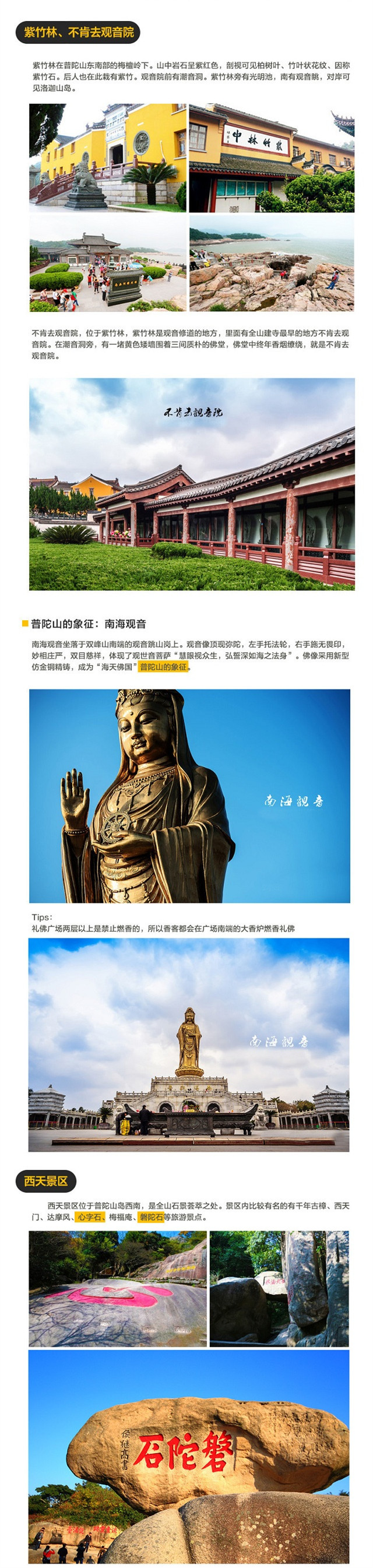 普陀山4日3晚(0自费0购物+西天景区+紫竹林景区+南海观音+普济寺+法雨寺+慧济寺+梵音洞+善财古洞+南塘老街)景点门票行程中所列景点首道大门票大交通火车往返二等座当地交通根据参团人数调派车型,保证一人一正座住宿行程所列酒店3晚住宿费用,标准2人间