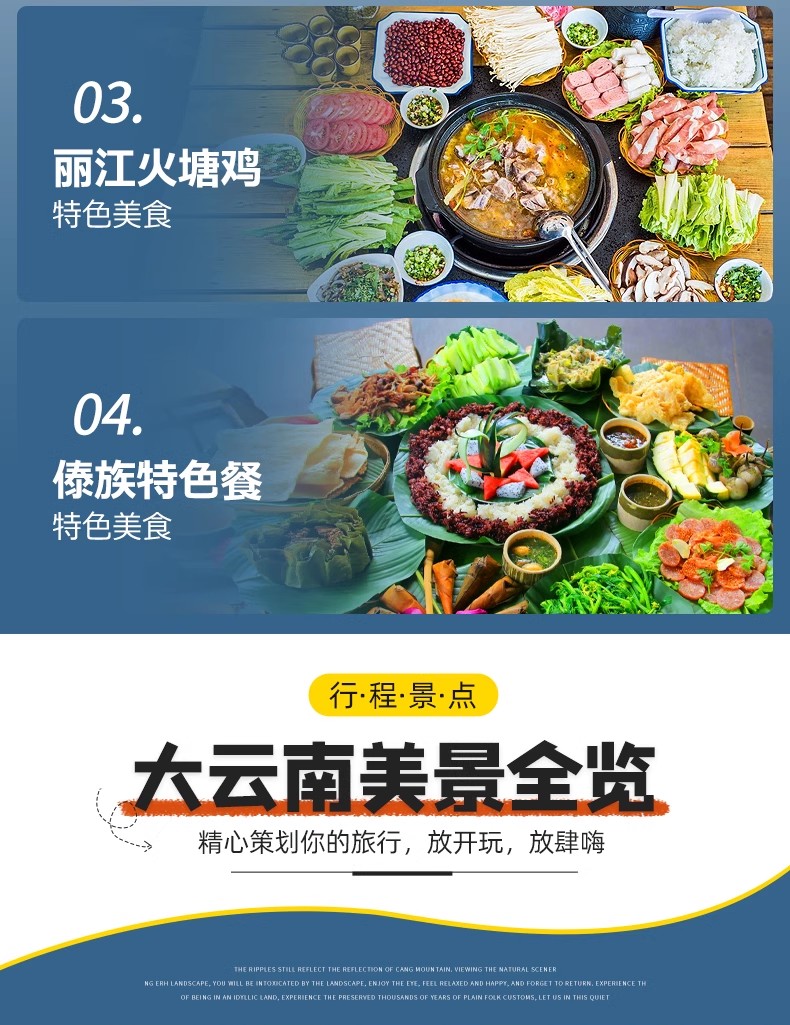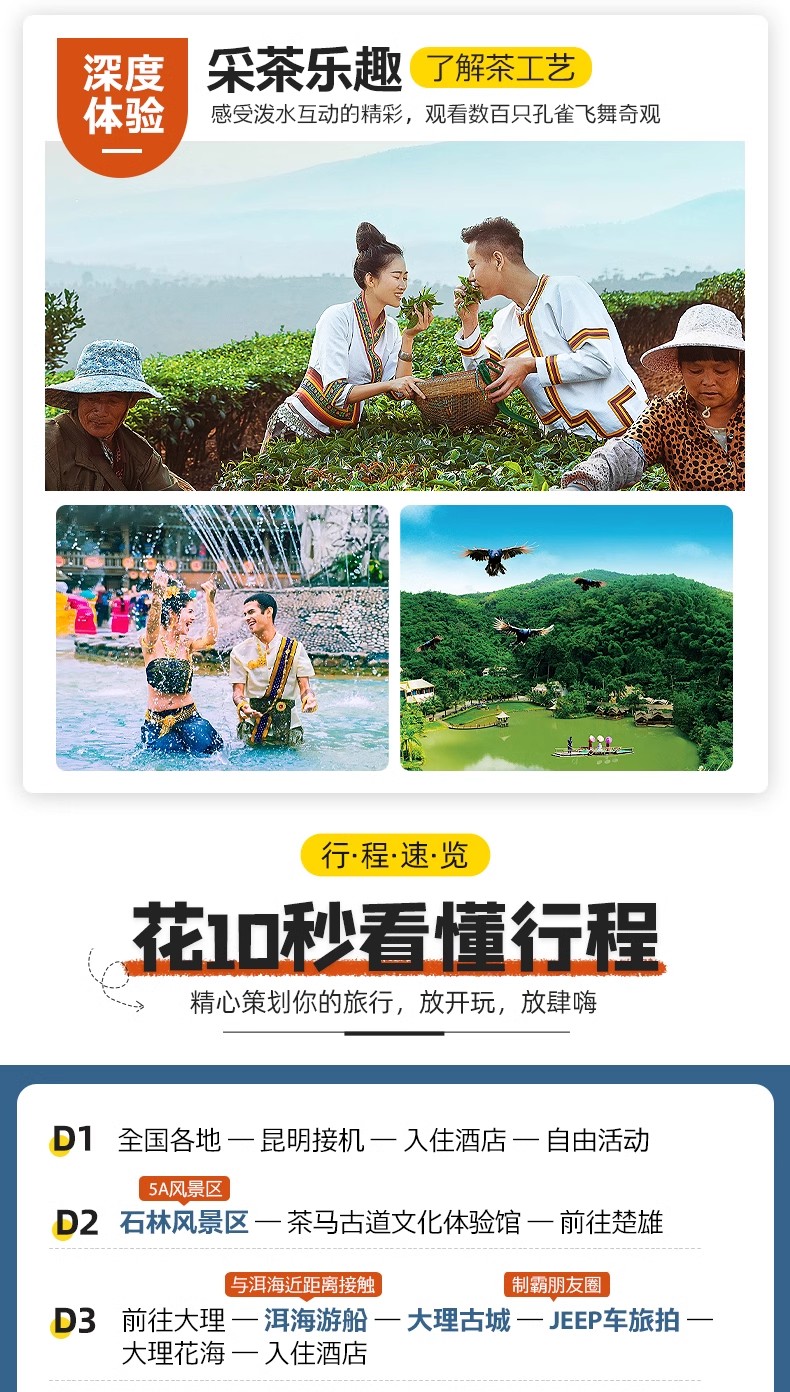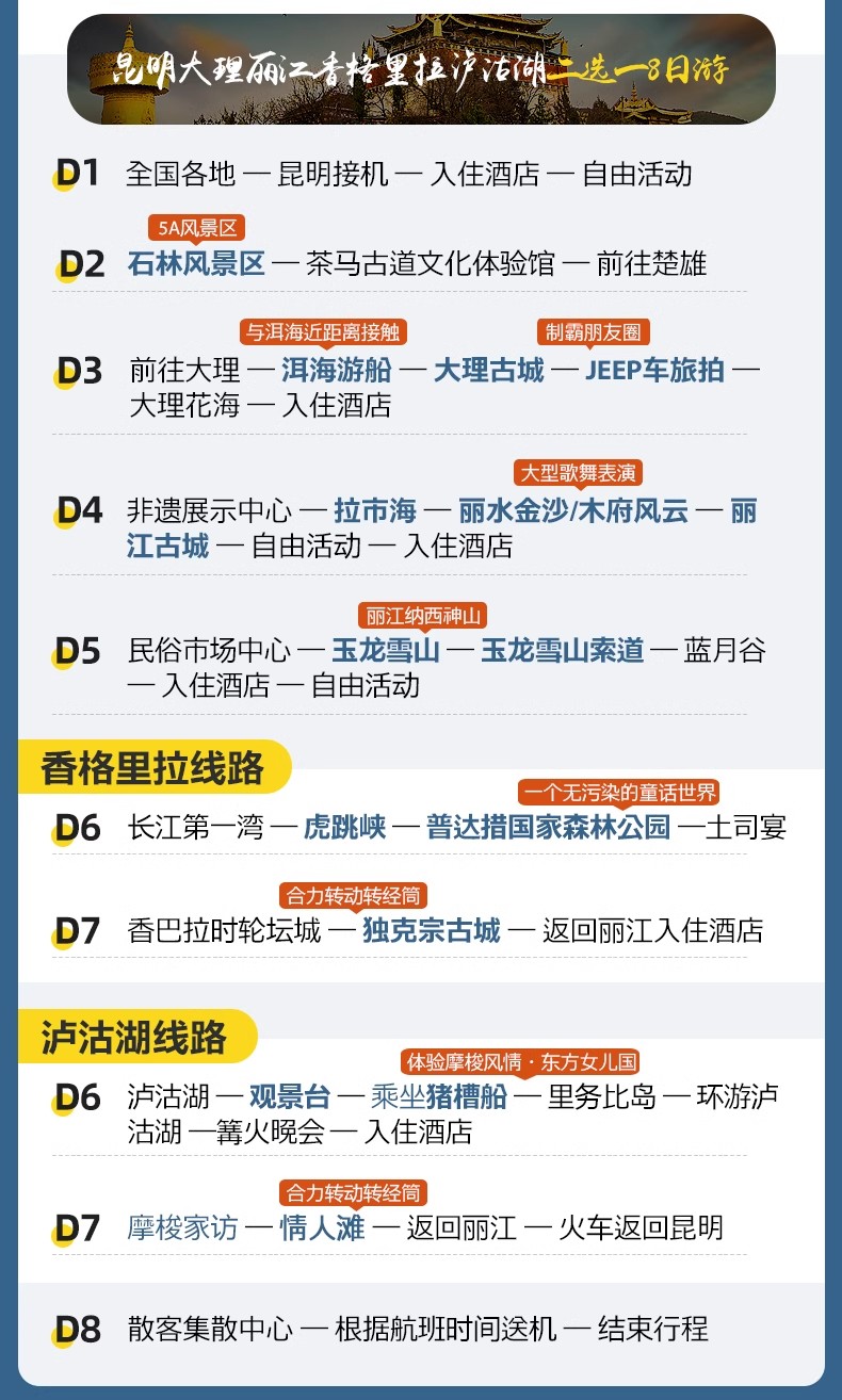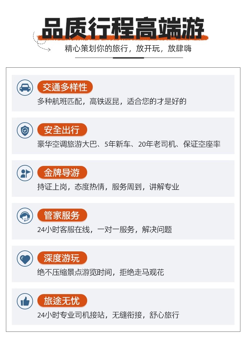 (1)温馨提示:本线路为全国散拼大团,2人起即可成团,下单之前麻烦您和客服确认好行程细节,不作咨询,直接下单无法安排,请见谅!由于身体状况不佳、孕妇、云南人、高龄(65岁以上)或患有严重高血压等心脑疾病的游客,请务必在下单前咨询客服,如直接拍下订单我社有权视身体状况而定是否接待(我社持解释权)!