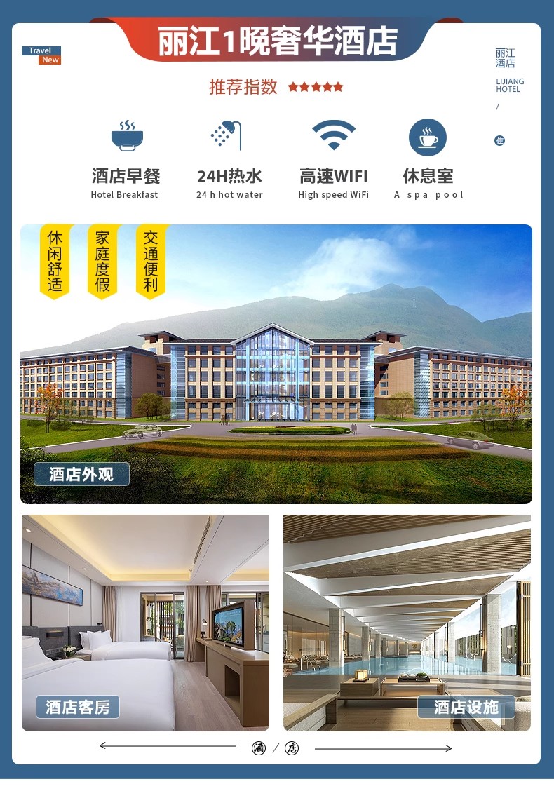 丽江酒店:大港旺宝,君澜丽江国际,官房主楼,金恒大酒店,复华丽朗,丽江别院 、实力希尔顿,希尔顿欢朋酒店、M酒店或同级