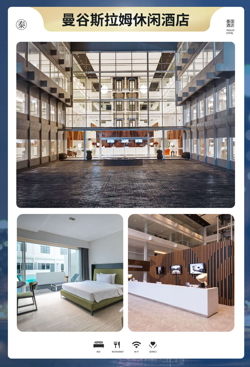 曼谷:曼谷集市酒店The Bazaar Hotel Bangkok 曼谷贵都酒店S Ratchada Hotel Bangkok 曼谷斯拉姆休闲酒店S Ram Leisure Hotel等同档次酒店(以实际安排入住为准)