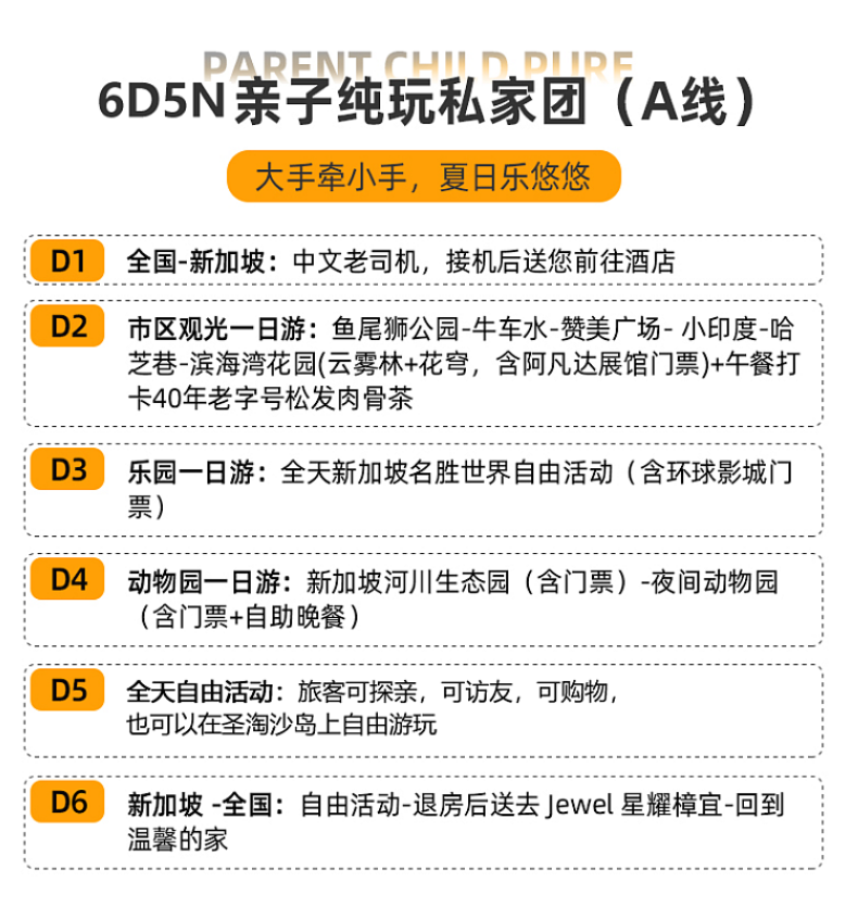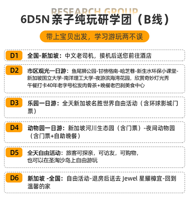 【带上宝贝去旅行】新加坡6天5晚半自助游(亲子研学游+新加坡国立/南洋理工大学+新生水环保小课堂+滨海湾花园+环球影城+鱼尾狮公园)景点门票行程中所列景点首道大门票大交通飞机往返经济舱机票