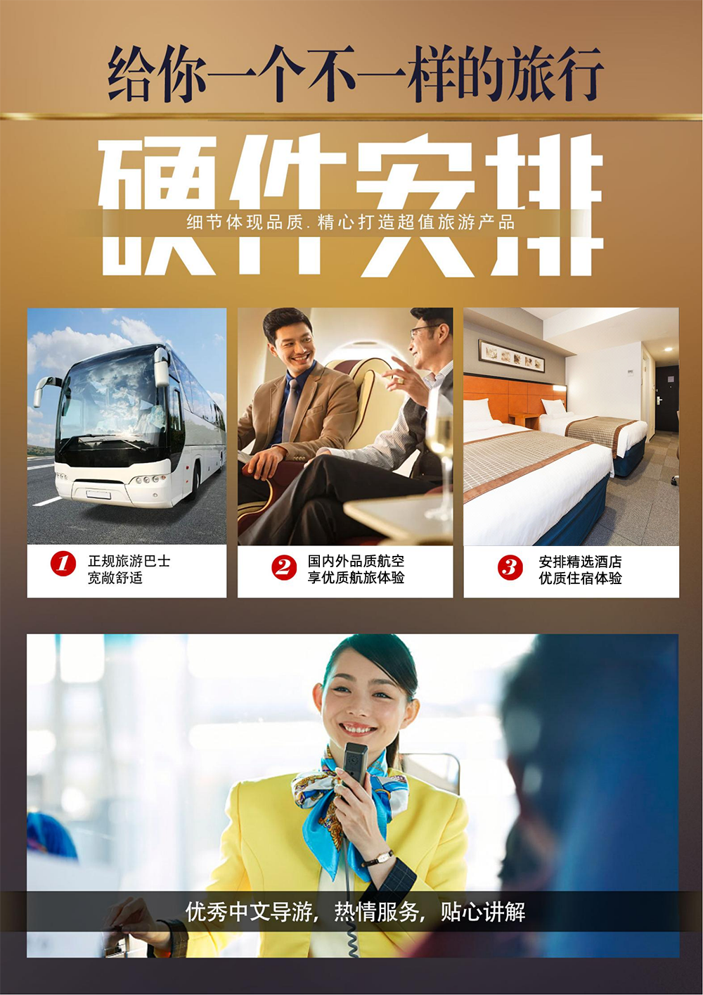 机场建设费当地交通根据参团人数调派车型,保证一人一正座住宿以客服发送的行程单中所列的住宿为准,默认两人住一间双人房。餐食以客服发送的行程单中所列的用餐为准,用餐一般为当地风味或中式团餐。导游服务领队和当地中文导游服务