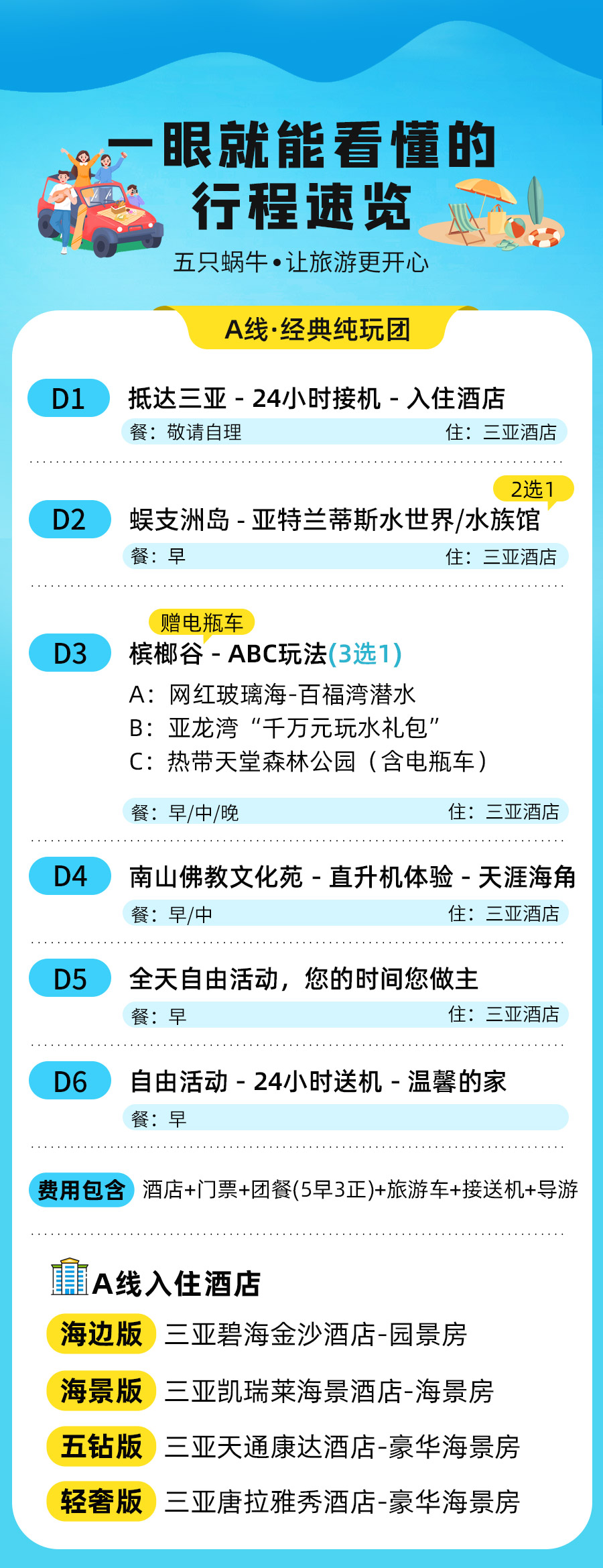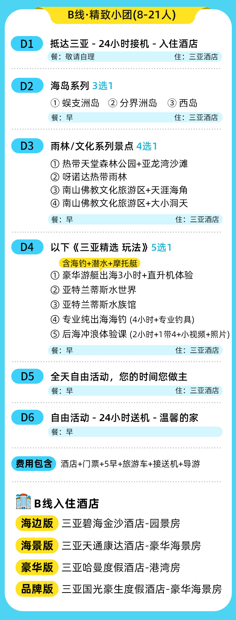 三亚动车站往返接送服务住宿行程所列酒店5晚住宿费用,标准2人间