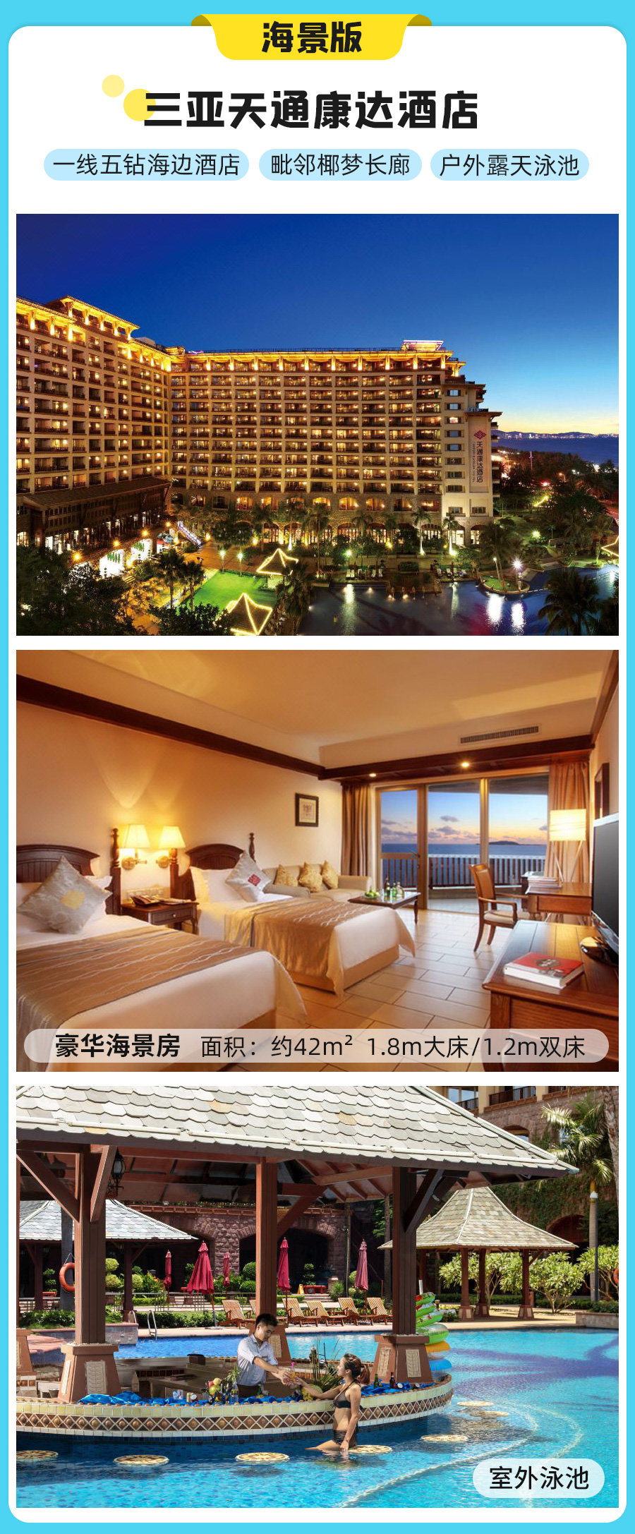 五钻版 三亚天通康达酒店-豪华海景房 备选酒店:君达酒店-高级海景房/十八渡蓝酒店-豪华海景房/克拉码头酒店-海景房/胜意度假酒店-90度海景房
