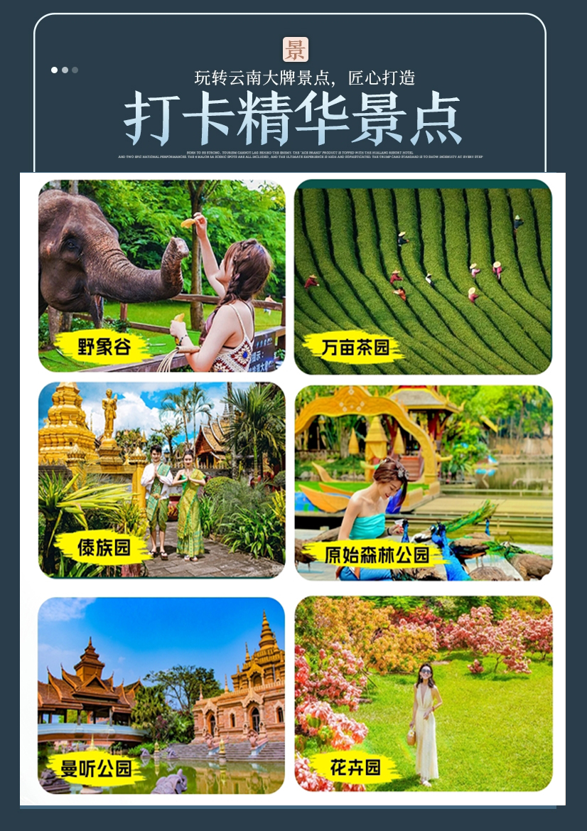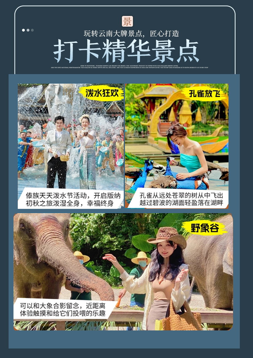 西双版纳参考酒店:西双版纳国投会展酒店,景洪恒蕴国际酒店,景洪上源国际酒店,西双版纳鑫盛时代酒店,活发大酒店,云南航空西双版纳观光酒店,滨港国际大酒店.西双版纳彬菲意达 腾云酒店或同级酒店(旺季会根据情况调整到其他同级酒店)餐食行程中所列餐食(飞机餐是否收费请参照航空公司规定)7早,9正餐