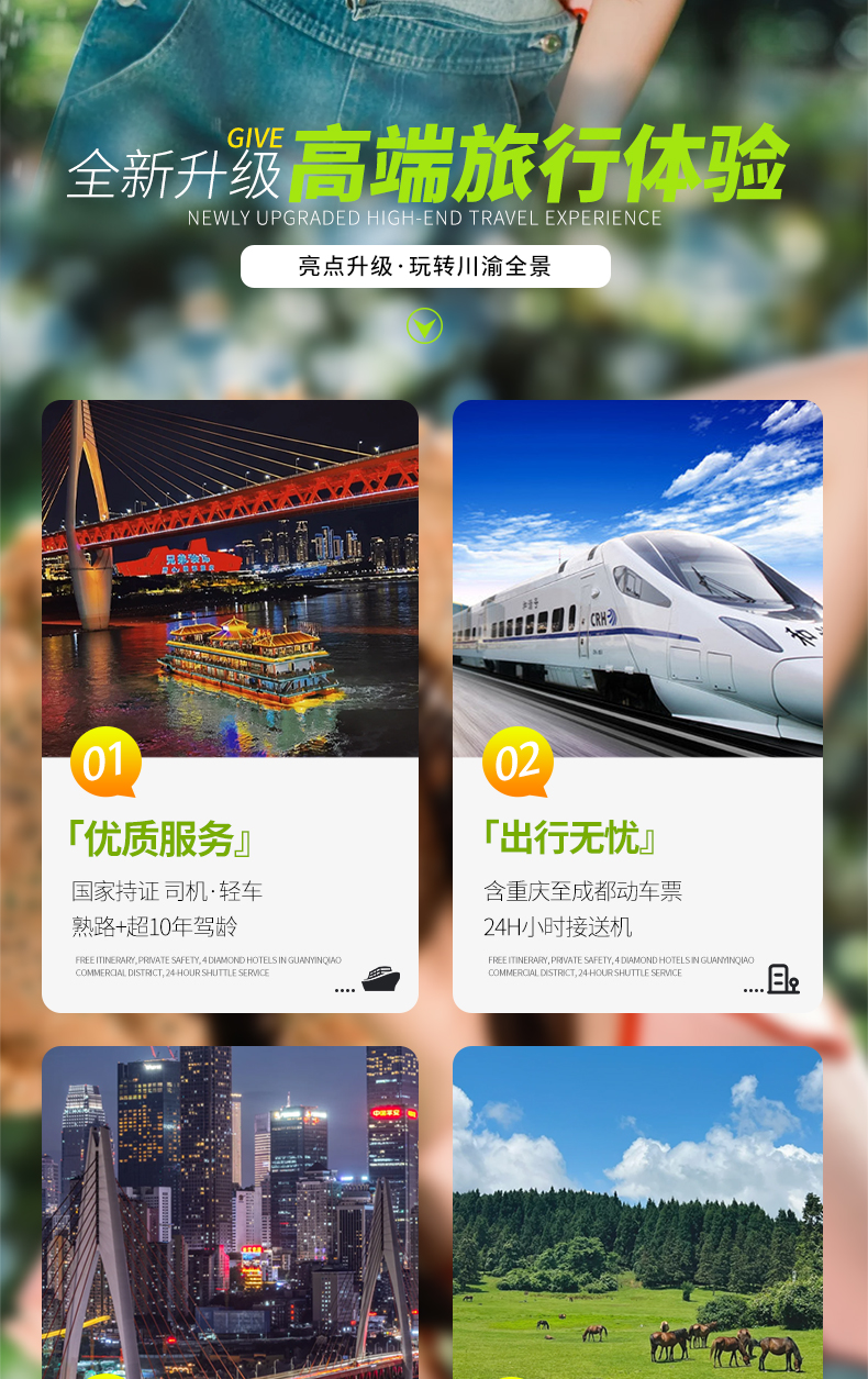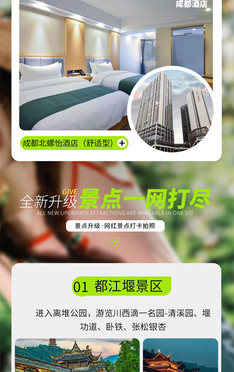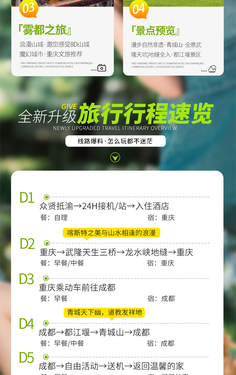 【川渝连线】四川+重庆5天4晚跟团游(市区商圈酒店+成都大熊猫基地+乐山大佛+峨眉山金顶+都江堰+洪崖洞+渣滓洞+解放碑+磁器口+网红轻轨)景点门票行程中所列景点首道大门票大交通飞机往返经济舱机票