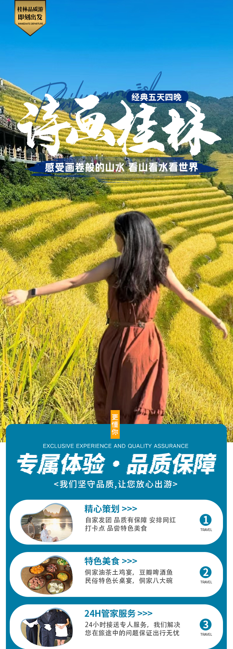 【纯玩·山水间实景演出】桂林龙脊梯田+漓江+阳朔5天4晚跟团游(遇龙河漂流+兴坪古镇+象鼻山+相公山+十里画廊+银子岩+侗族鼓楼+世外桃源)景点门票行程中所列景点首道大门票