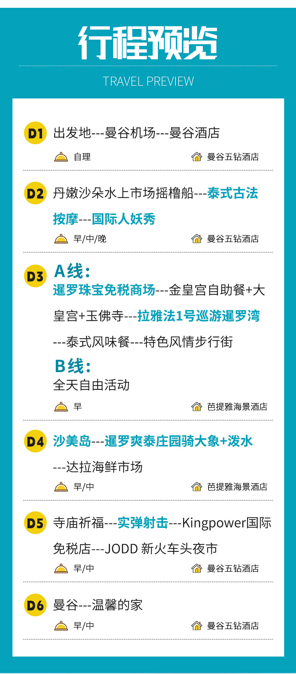 芭堤雅:指定芭提雅品牌国际五星温德姆酒店餐食行程中所列餐食(飞机餐是否收费请参照航空公司规定)5早,4正餐导游服务当地中文导游服务