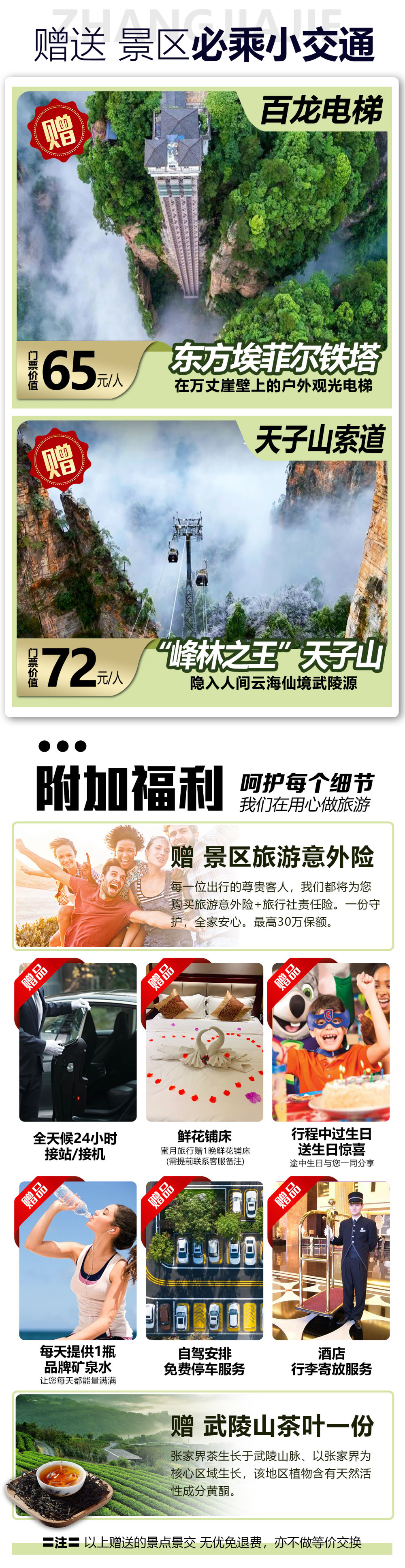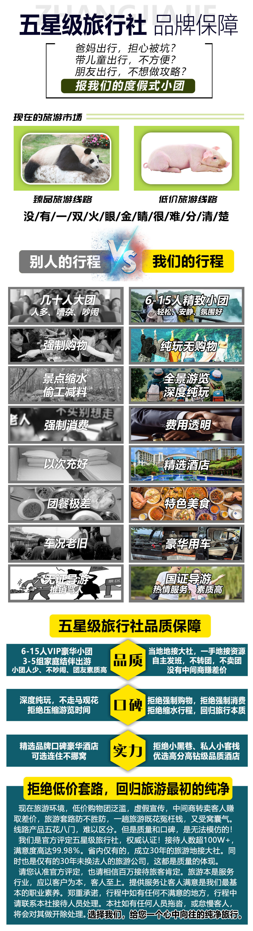 5、张家界旅游区为成熟景区,如遇下雨也不会影响整个行程,请勿担忧。行程中在不减少行程景点的情况下,导游可根据景区客流量合理调配所看景点的先后顺序,请知悉!