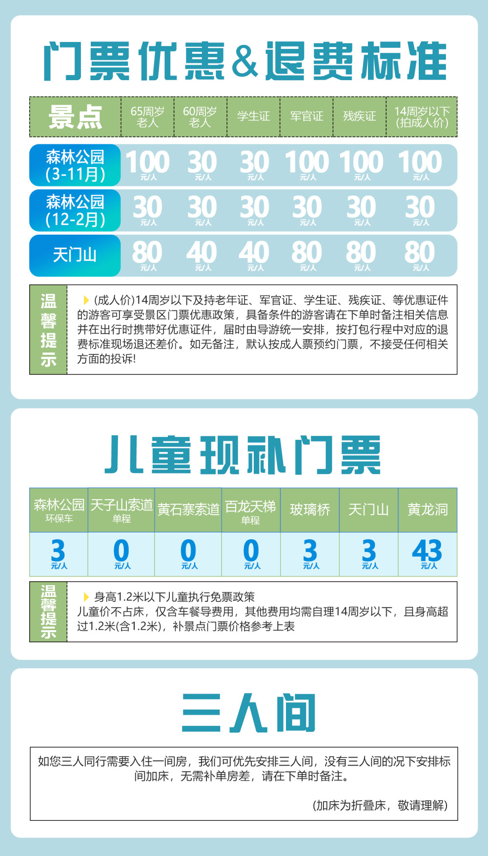 1、天门山景区开通A/B/C游览线路:A线为索道上山,环保车下山;B线为环保车上山,索道下山;C线为环保车上下山;具体走哪条线路由景区随机调配安排为准,不能指定,且无差价退还,敬请谅解。