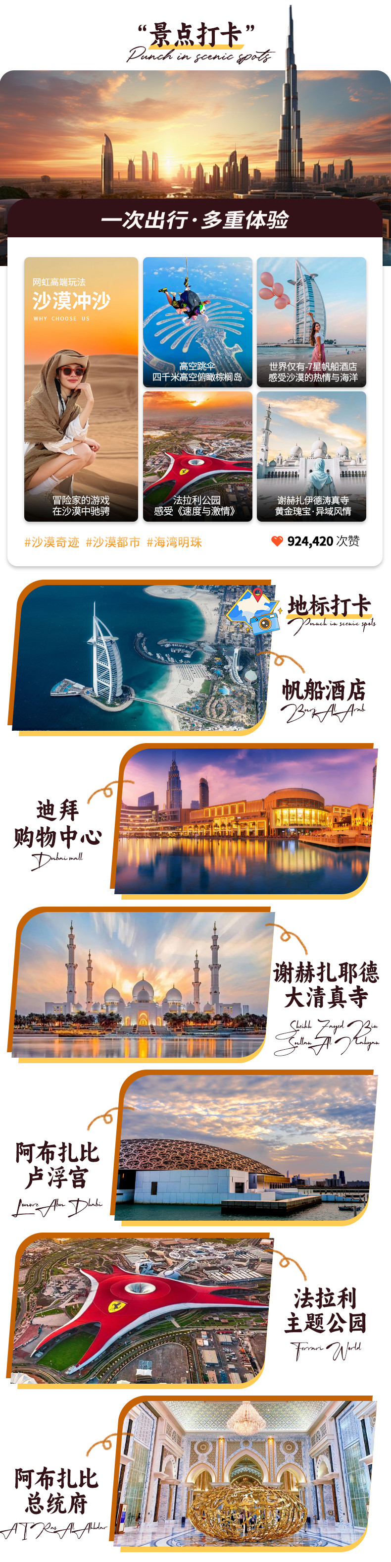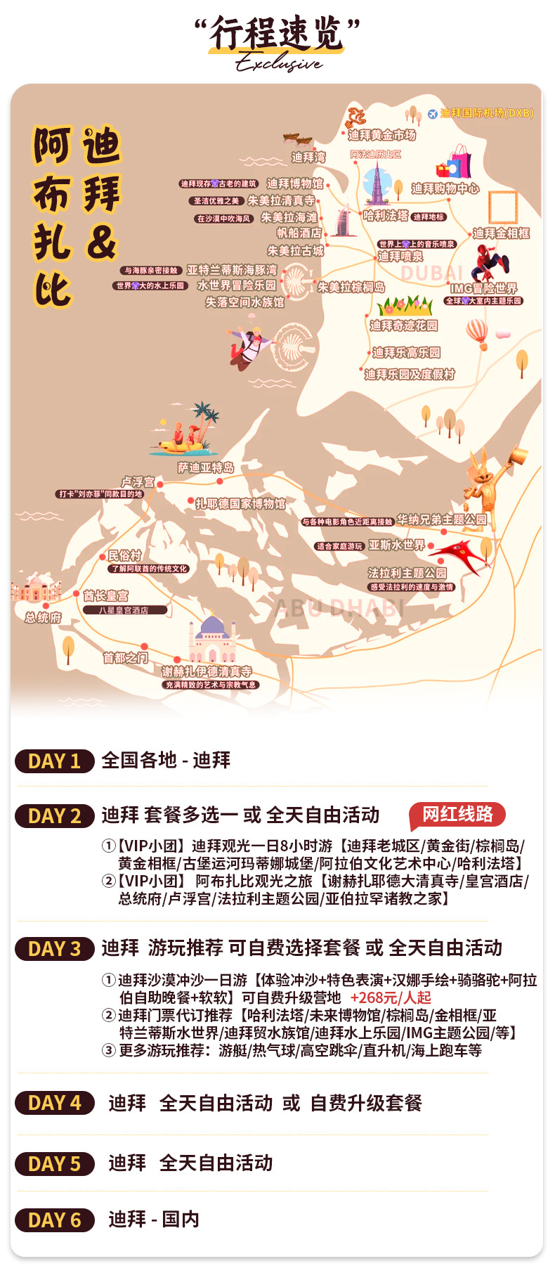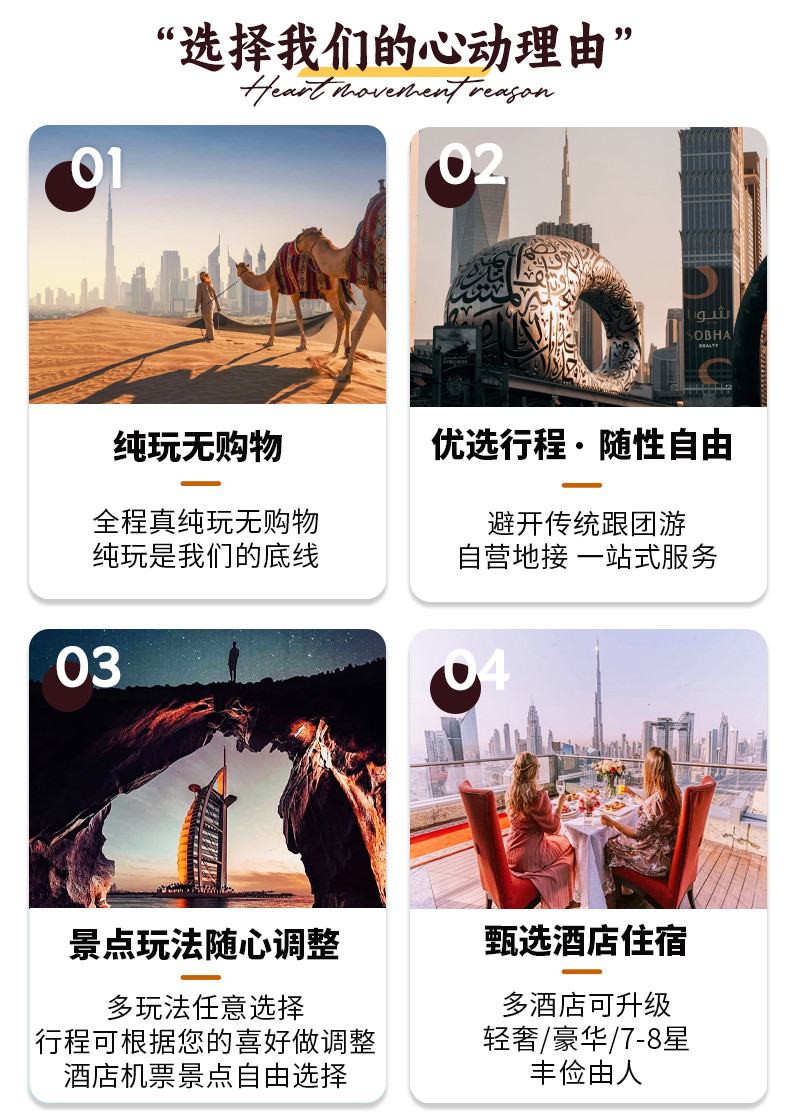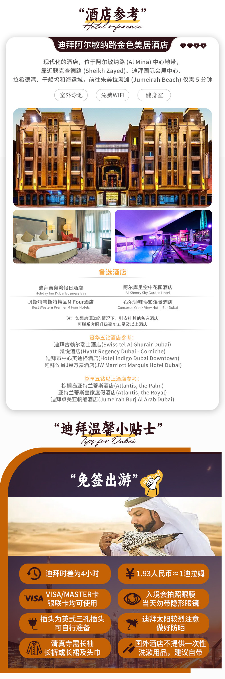 迪拜机场往返接送服务住宿行程所列酒店5晚住宿费用,标准2人间餐食行程中所列餐食(飞机餐是否收费请参照航空公司规定)5早,0正餐导游服务当地跟团行程相关默认英文导游服务(自由活动期间不含车导服务)及全程微服务签证/签注免签