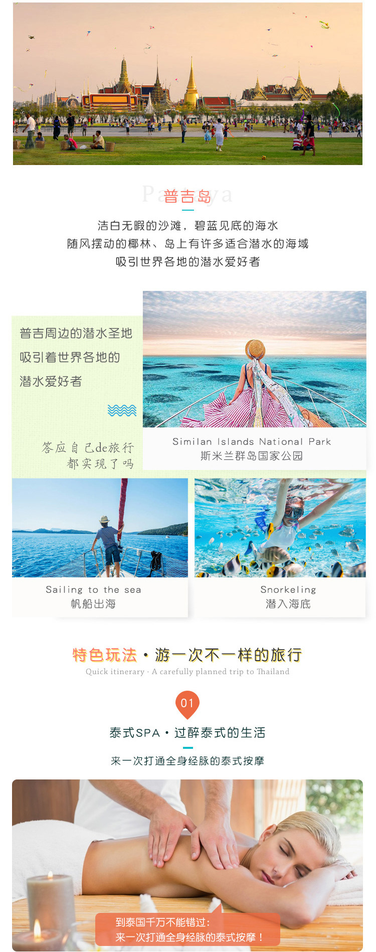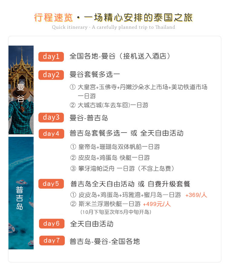 【纯玩无购物】全国出发泰国曼谷+普吉岛+斯米兰7天6晚半自助游(体验泰式美食+出海浮潜圣地+西蒙人妖秀+江西冷+芭东海滩+赠接送机)景点门票行程中所列景点全部门票,不含的项目在费用不含中列举大交通飞机往返经济舱机票