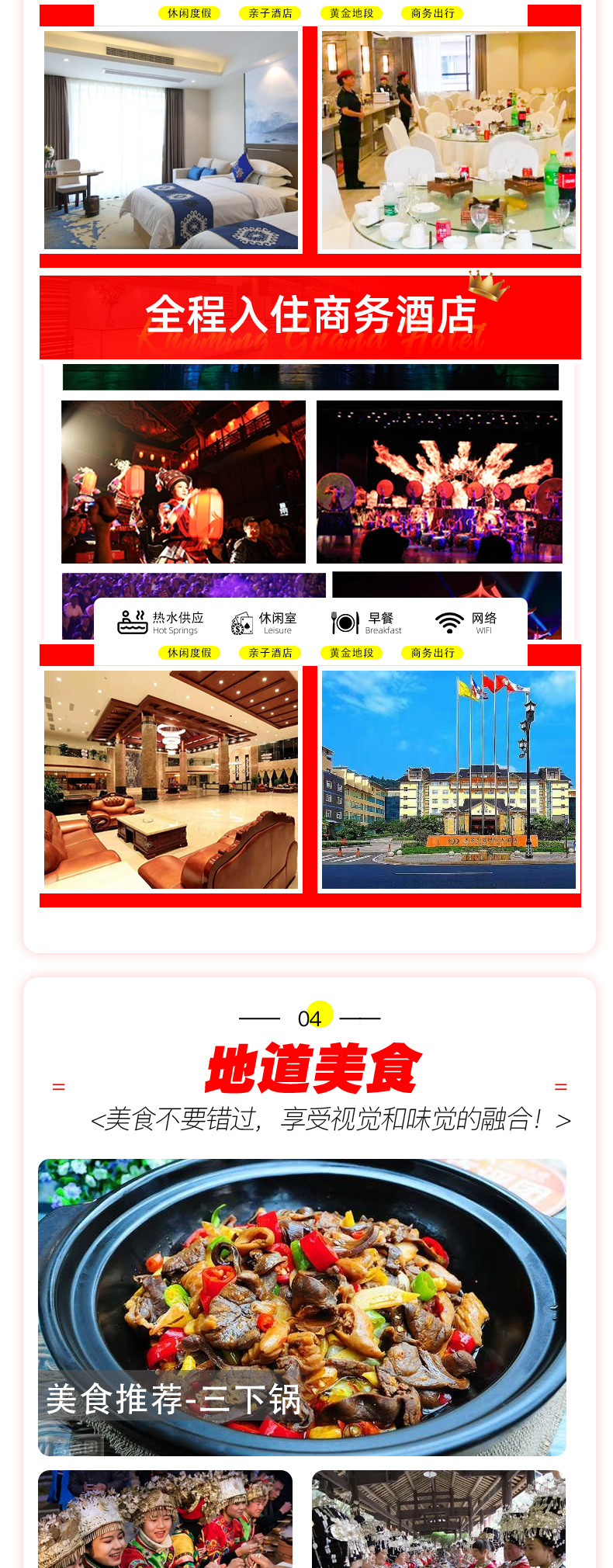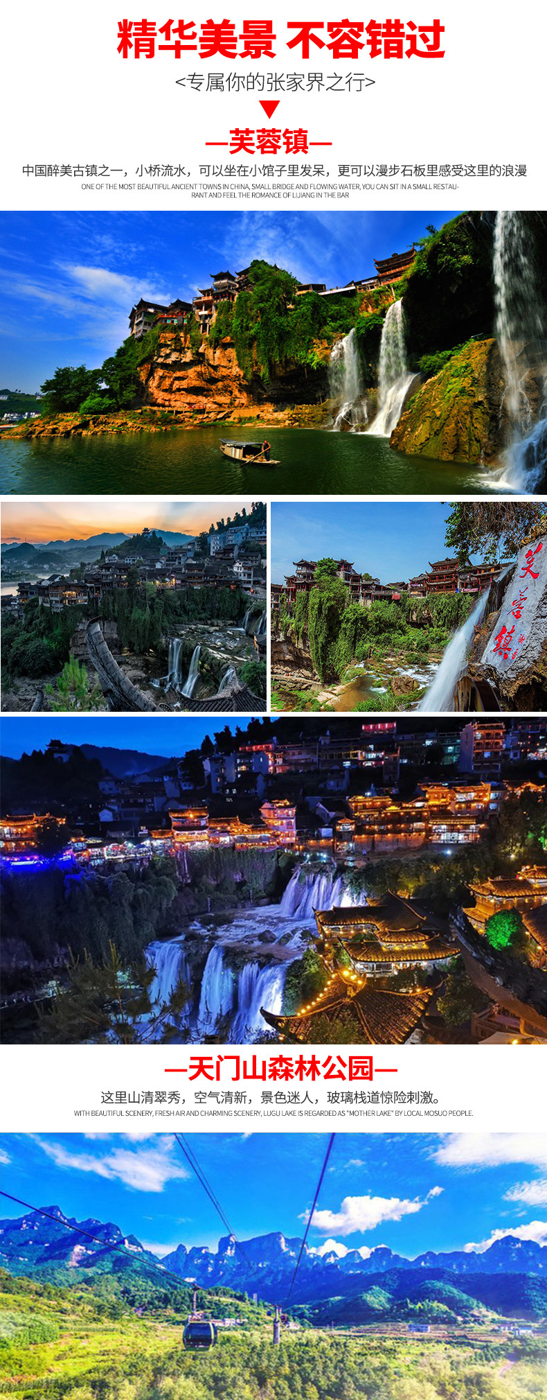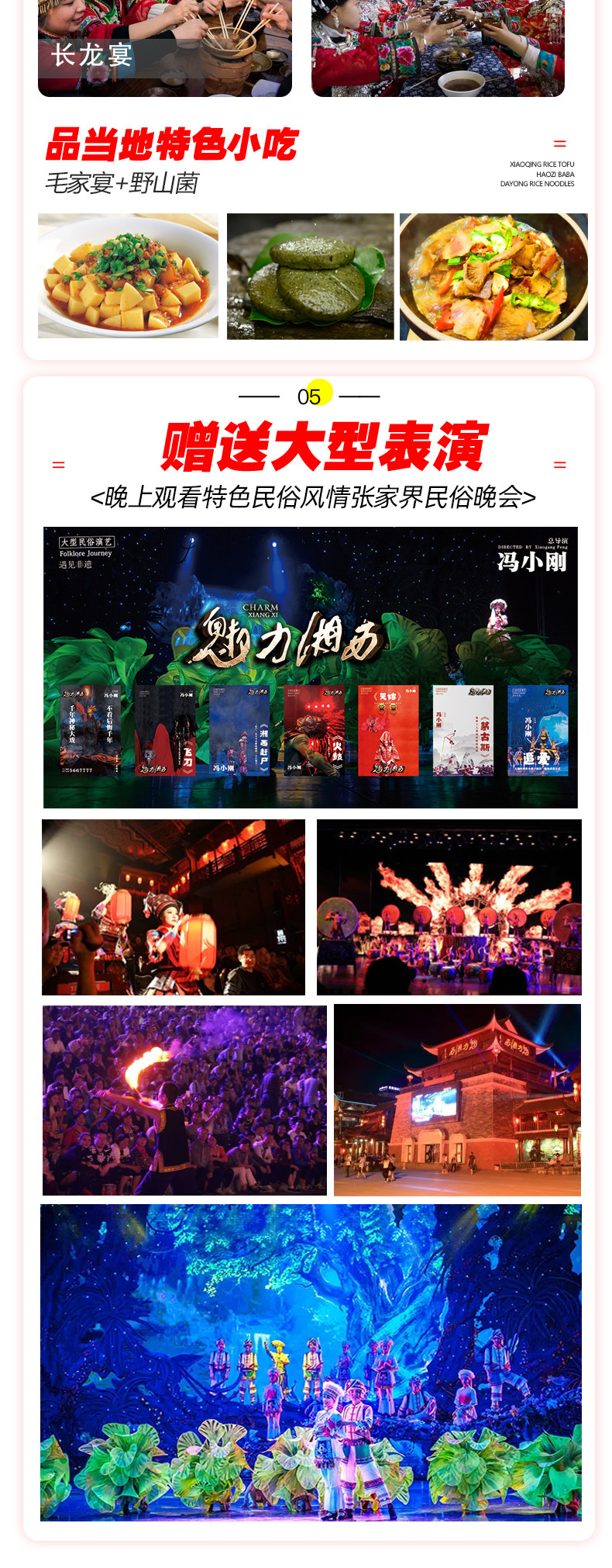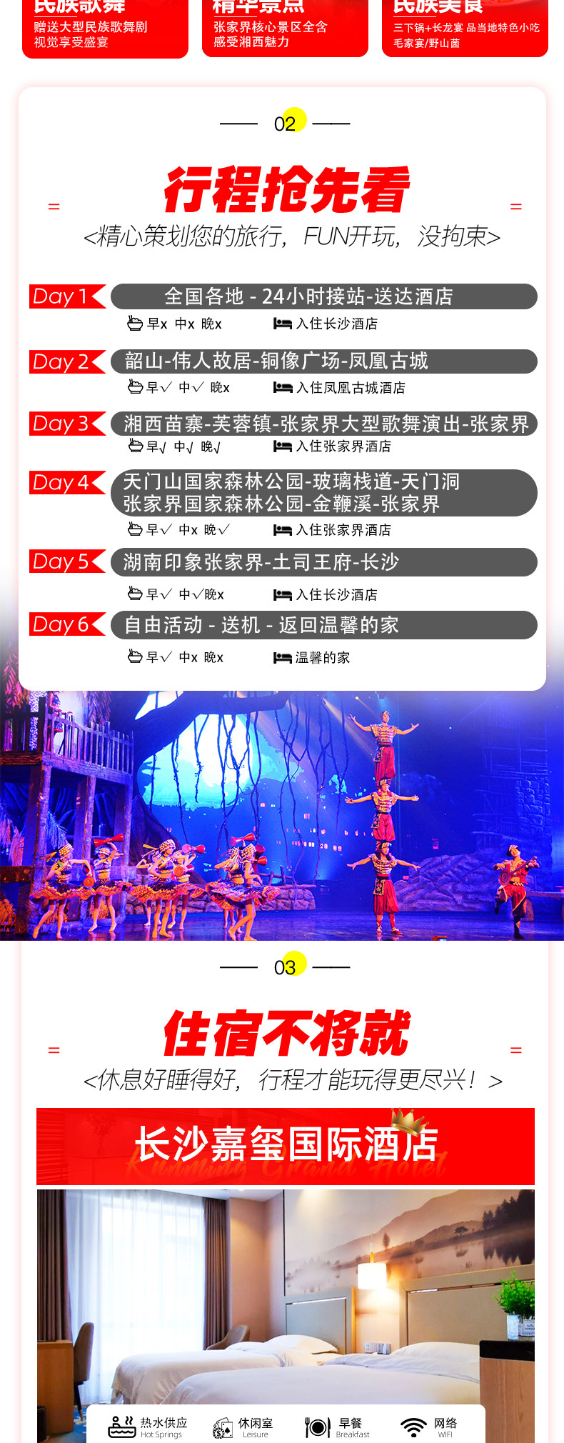 赠送:价值280元/人民俗歌舞晚会+夜游凤凰古城+芙蓉镇+天门山玻璃栈道鞋套一次+矿泉水+新婚夫妻免费升级2晚大床房,尊享苗家祝福贺礼一份+过生日的客人,赠送生日蛋糕(所有赠送附带服务以及产品若客人不用或因特殊情况无法赠送,不做等值置换,费用不退)