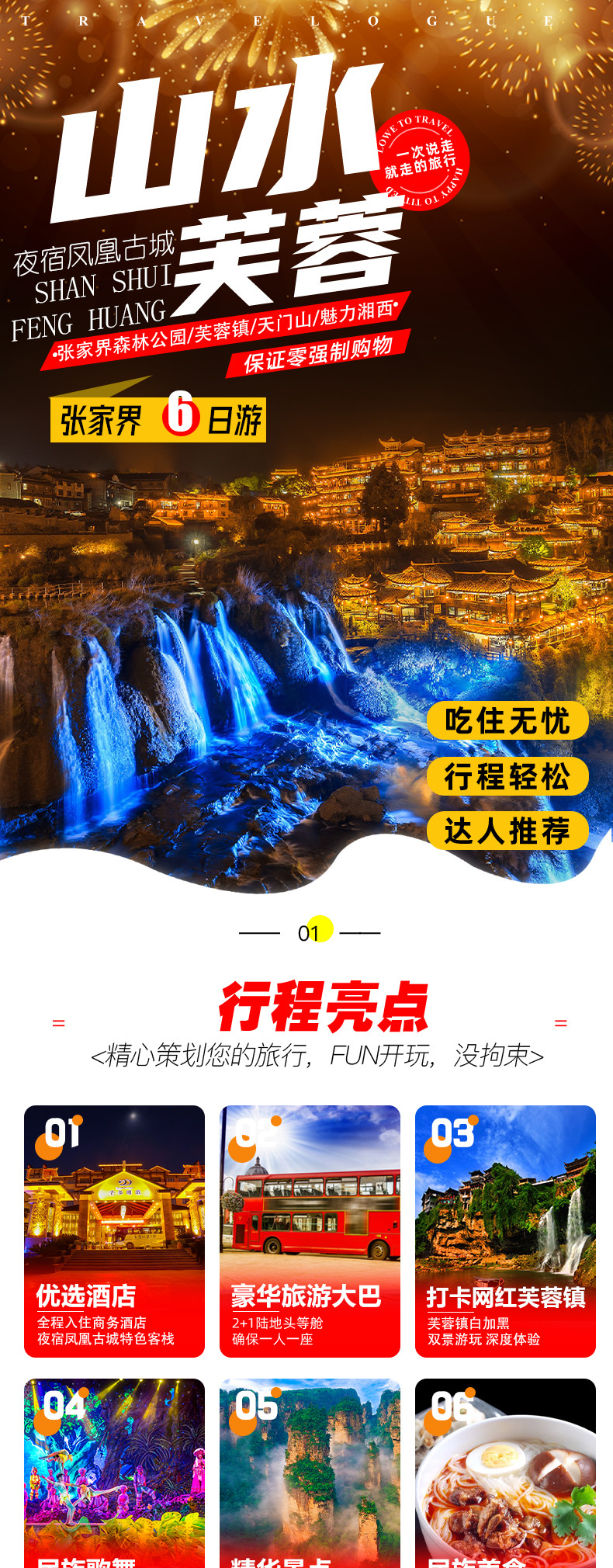 【2+1陆地头等舱·一价全含0自费】湖南长沙+张家界+凤凰古城6天5晚跟团游(升级凤凰古城客栈+森林公园+芙蓉镇+天门山+湘西苗寨+土司城)景点门票行程中所列景点首道大门票