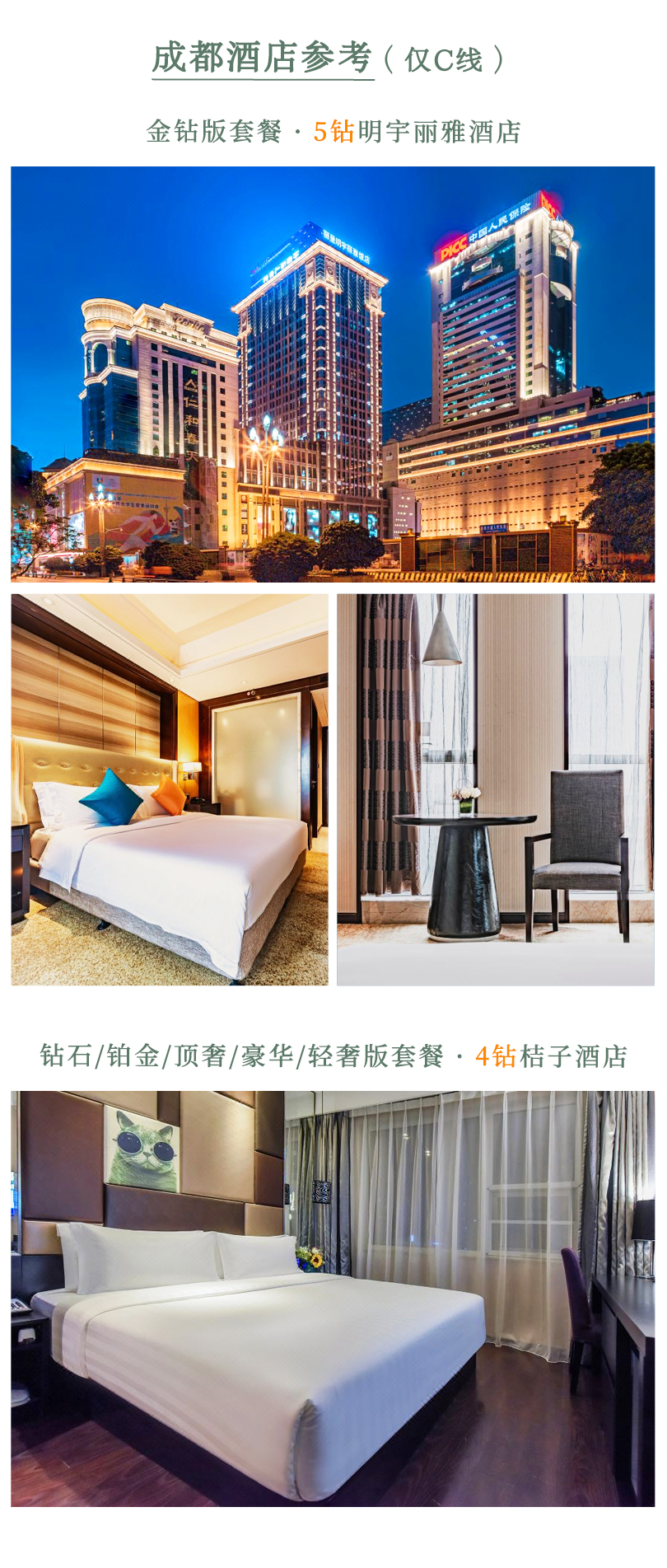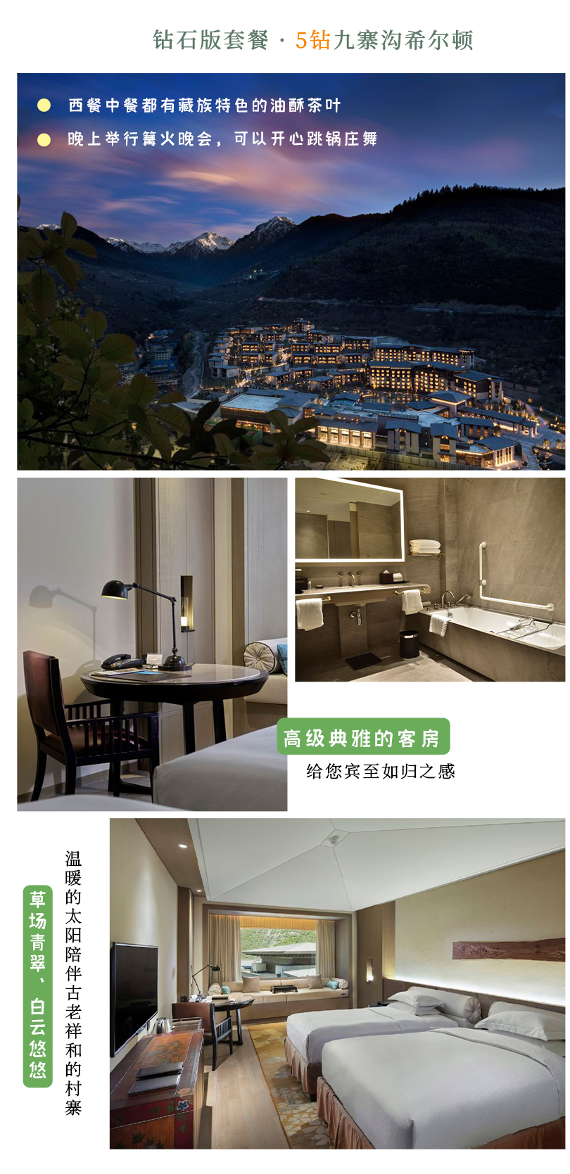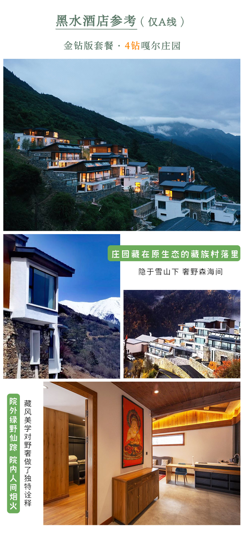 金钻套餐:九寨沟入住当地5钻或5星康莱德酒店2晚、黑水入住当地4钻或4星嘎尔庄园1晚、都江堰入住当地5钻或5星百伦国际/新华海颐/总府皇冠(B线)、成都入住当地5钻或5星明宇丽雅/缦道/明悦酒店(C线);