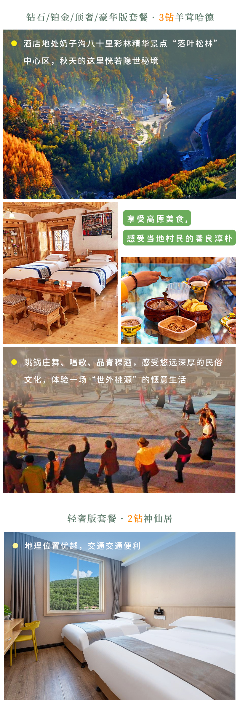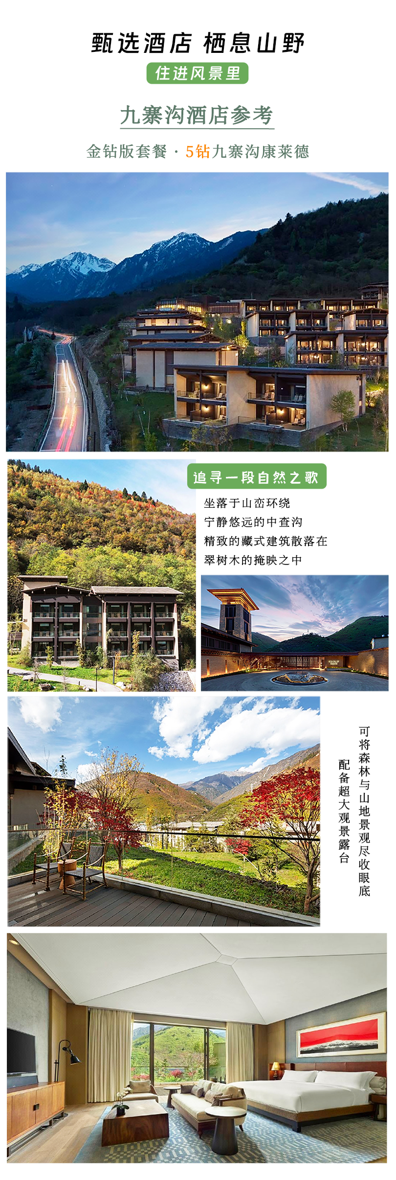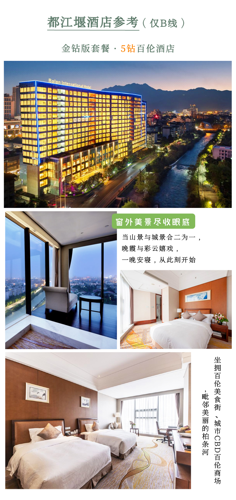 金钻套餐:九寨沟入住当地5钻或5星康莱德酒店2晚、黑水入住当地4钻或4星嘎尔庄园1晚、都江堰入住当地5钻或5星百伦国际/新华海颐/总府皇冠(B线)、成都入住当地5钻或5星明宇丽雅/缦道/明悦酒店(C线);