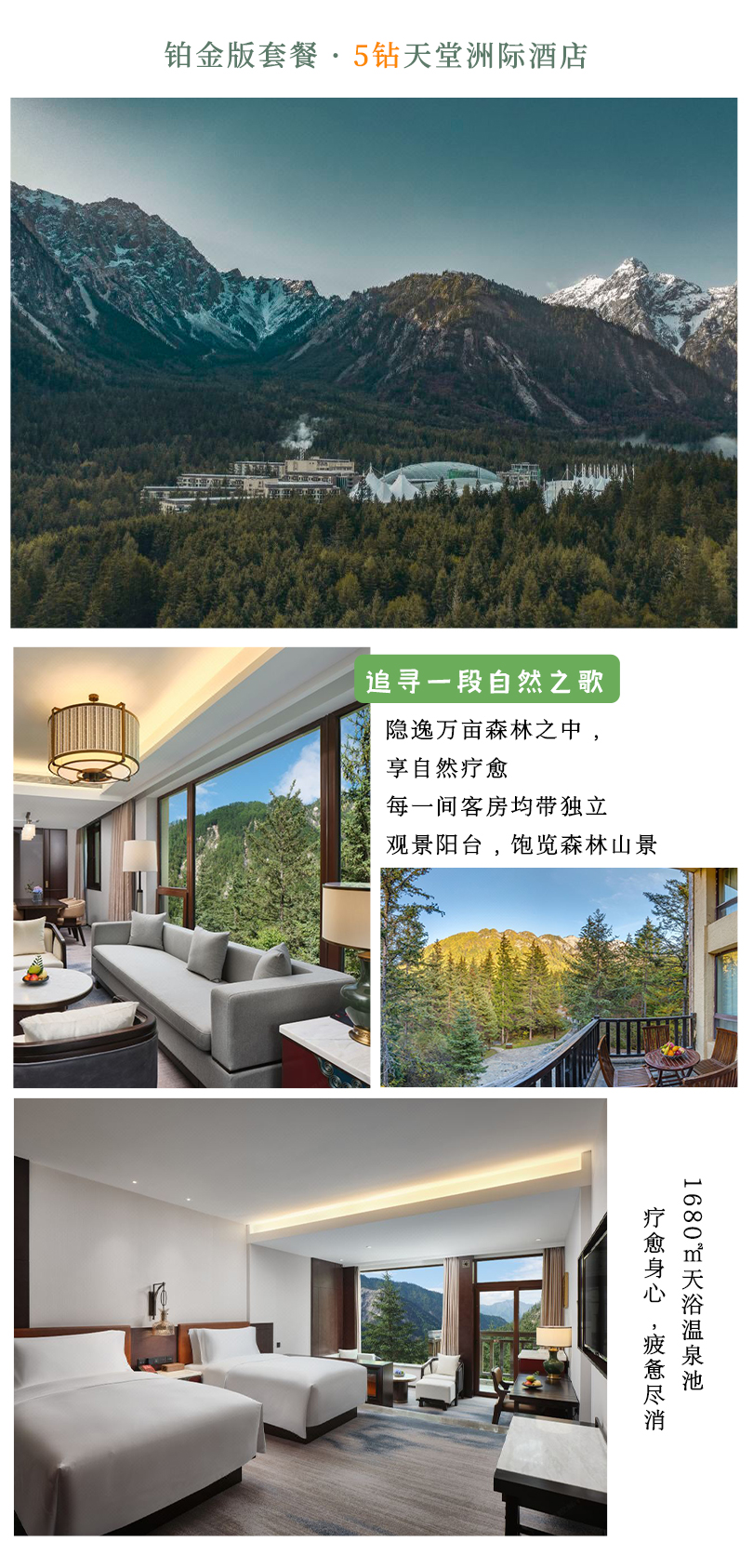 铂金套餐:九寨沟入住当地5钻或5星天堂洲际酒店2晚、黑水入住当地3星或3钻羊茸哈德/远山拾梦/央宗林卡/达古冰川酒店1晚(A线)、都江堰入住当地4钻或4星古城度假/中心国际/上禾国际/维亚纳南桥店/喆啡景区店1晚(B线)、成都入住当地4钻或4星桔子/美丽华/锦著酒店(C线);;