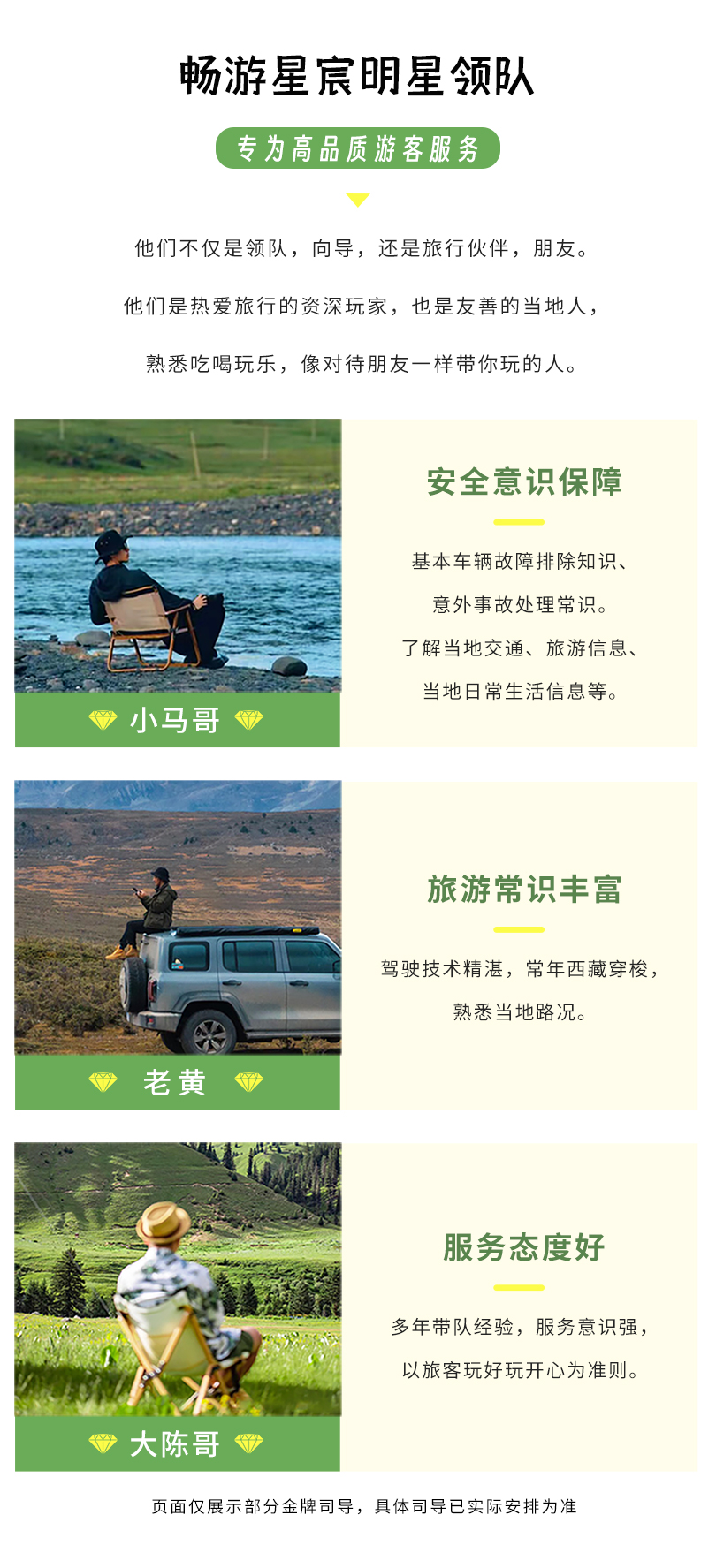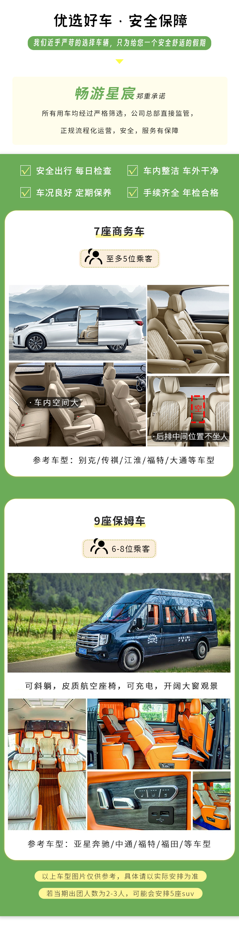 2-3人使用5座suv(参考哈弗H6/本田CRV/现代/丰田等车型)、4-5人使用7座商务车(参考别克GL8/大通G10/福特新全顺等车型),若当期出团人数满6人,免费升级9座1+1舒适保姆车(参考车型亚星奔驰/中通/福特福田等车型),配独立航空座椅,USB充电口,可座可躺;住宿行程中所列酒店,3晚当地酒店,6种标准可选。注:高原地区住宿条件有限,不能以内地大城市眼光看待;