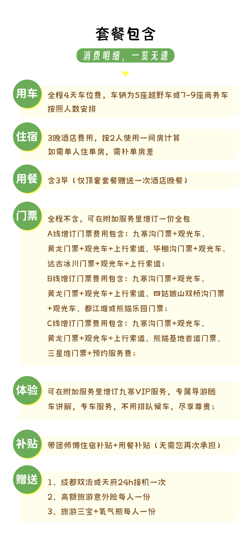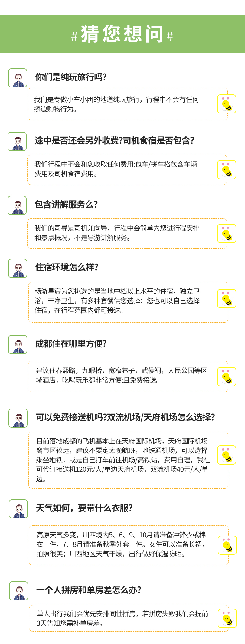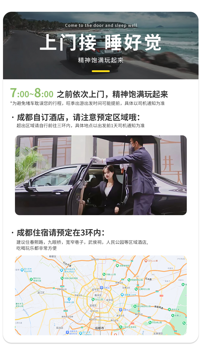 接送:出团日成都市三环内酒店上门接,散团日送至成都三环内指定地点;