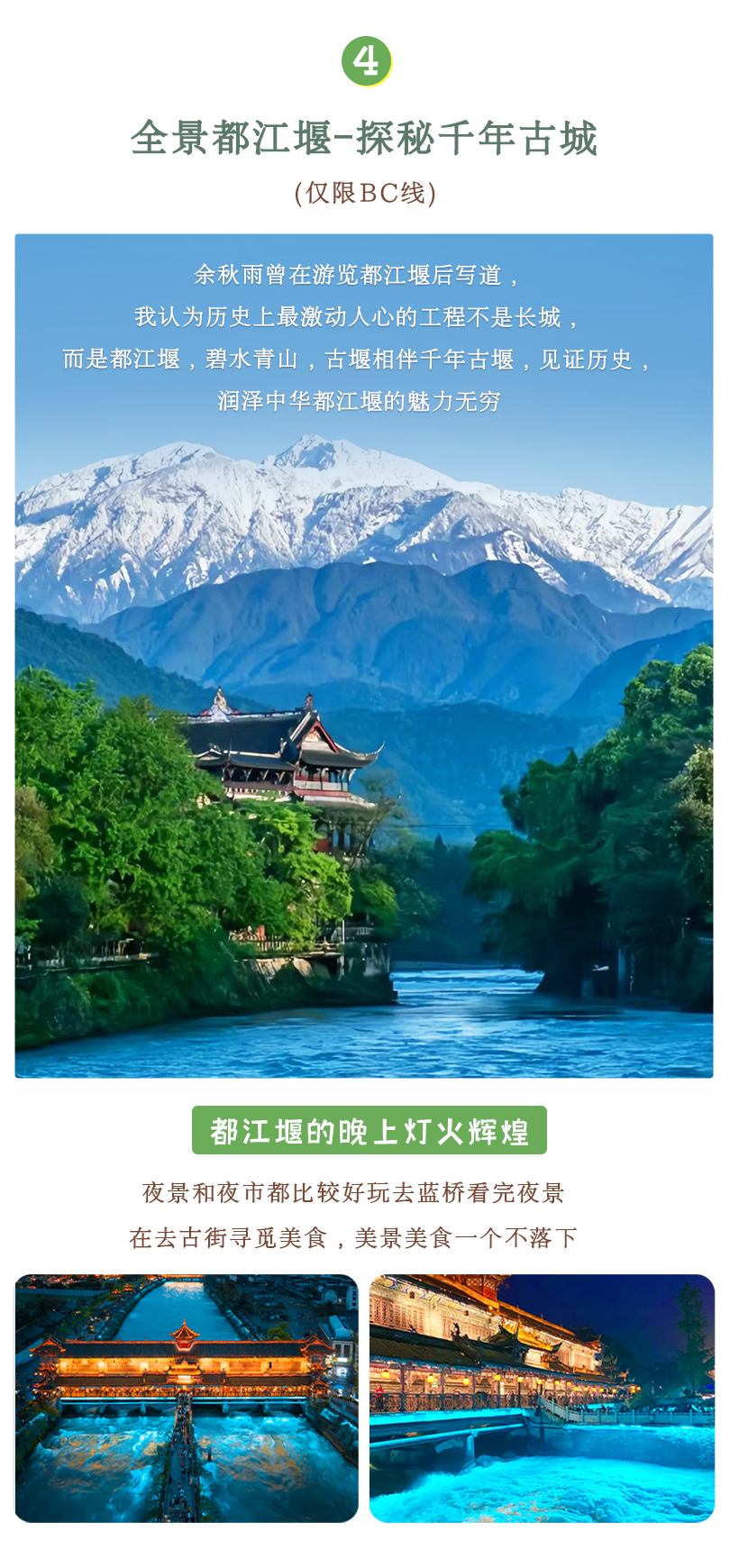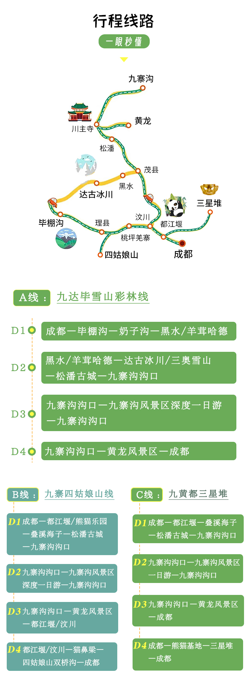 豪华套餐:九寨沟入住当地5钻或5星玺舍云山温泉酒店/戴斯温德姆/2晚、黑水入住当地3星或3钻羊茸哈德/远山拾梦/央宗林卡/达古冰川酒店1晚(A线)、都江堰入住当地4钻或4星古城度假/中心国际/上禾国际/维亚纳南桥店/喆啡景区店1晚(B线)、成都入住当地4钻或4星桔子/美丽华/锦著酒店(C线);;