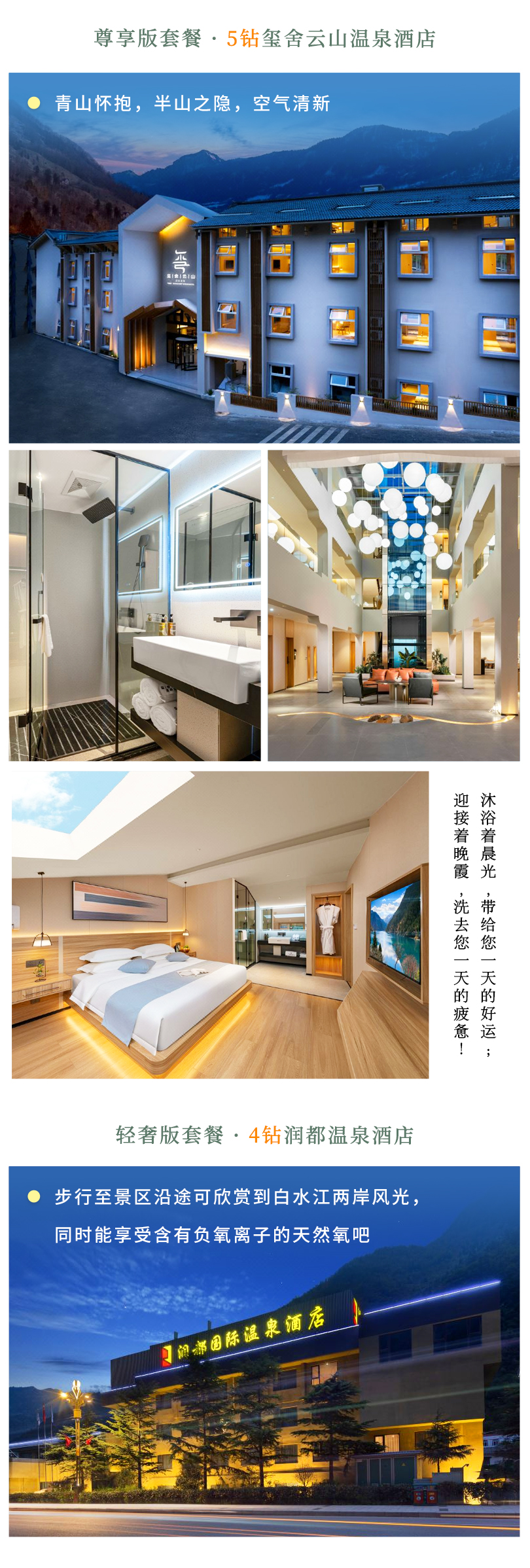 轻奢套餐:九寨沟入住当地4钻或4星吉盛/名人/润都温泉/璞枫·丽舍酒店2晚、黑水入住当地2钻或2星神仙居/芦花温泉/彩林印象酒店1晚(A线)、都江堰入住当地4钻或4星古城度假/中心国际/上禾国际/朗丽兹/喆啡景区店1晚(B线)、成都入住当地4钻或4星桔子/美丽华/锦著酒店(C线);