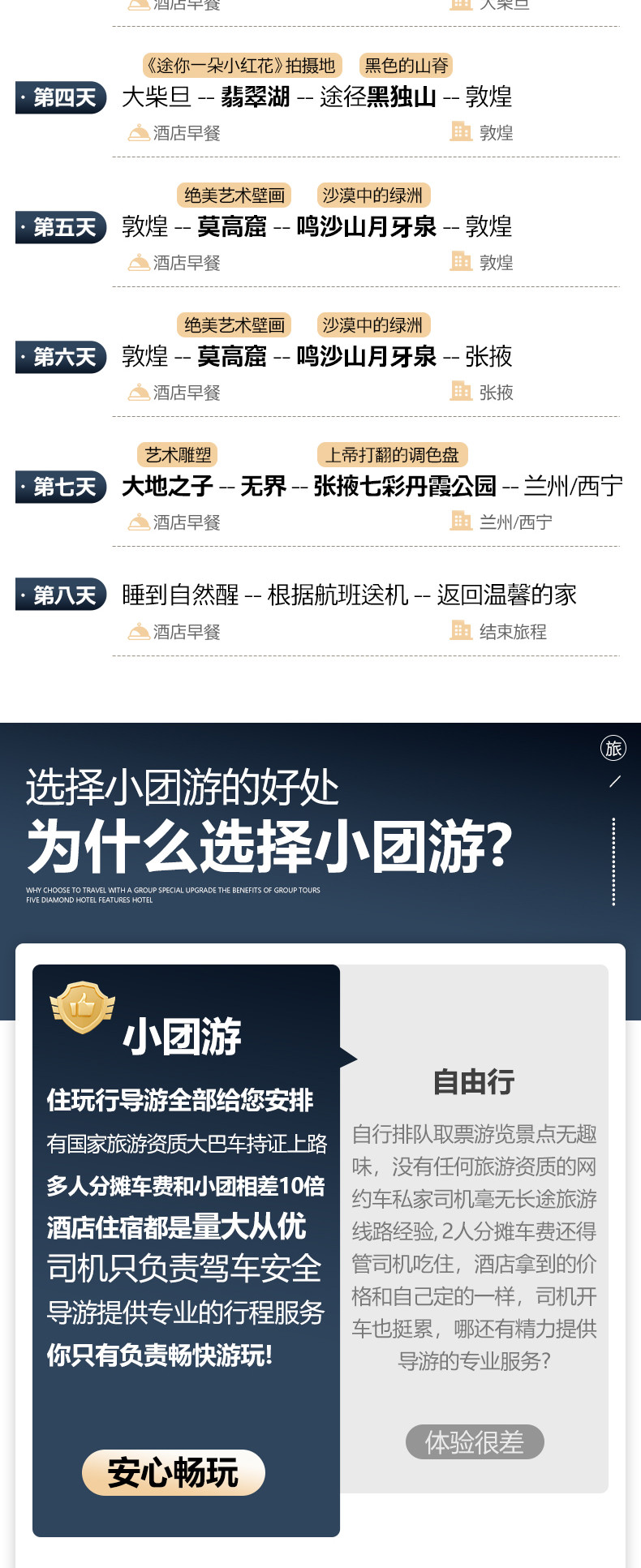 西北旅游环境特殊大多酒店都不配备三人间以及加床服务,且不提供自然单间, 如需要我社安排大床房(下单请备注清晰,不能保证全程大床,只能尽量安排),单人 请提前补房差。