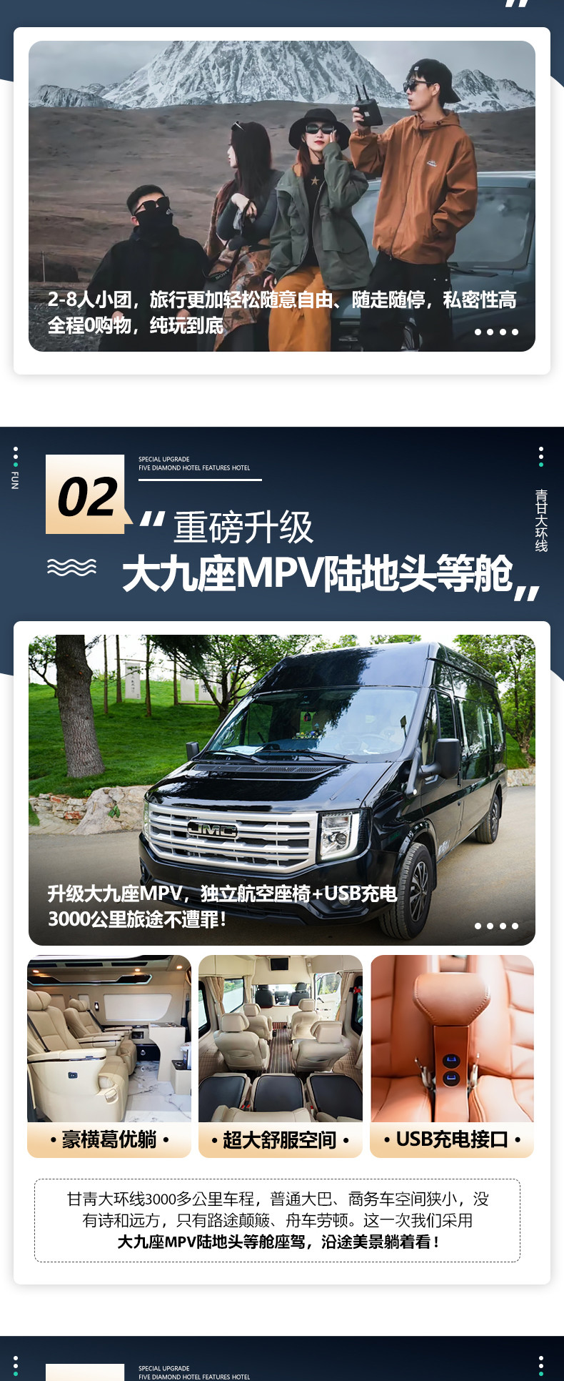 2-4人安排5座小车、5-6人安排7座商务车、7-8人升级大9座豪华用车;一人一座,独立VIP观景窗,资质合法手续齐全、航空可调座椅,3000公里环线躺着不受罪;住宿行程中所列酒店,7晚精选2-3钻酒店