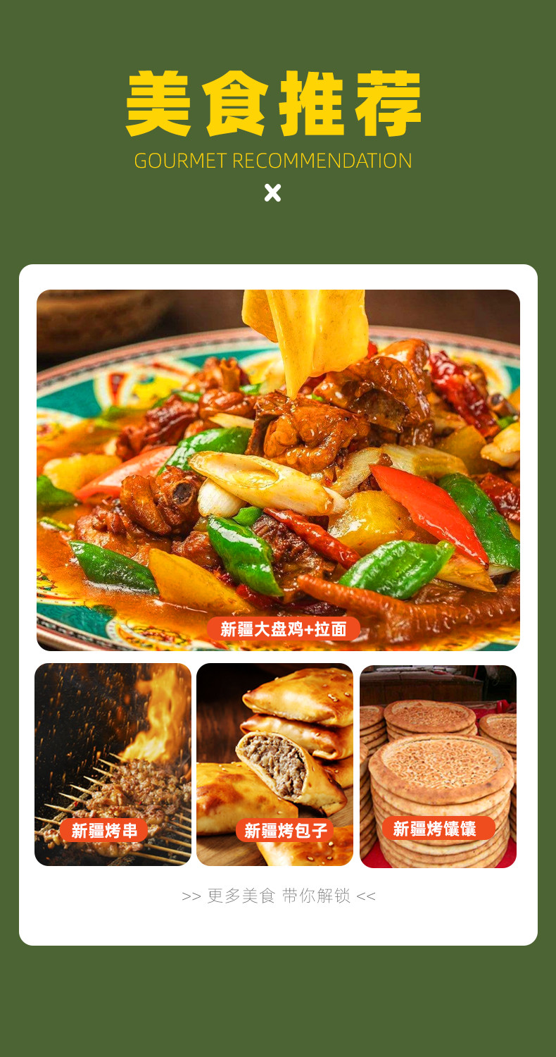 新疆气候干燥,饮食口味浓重,喜辛辣。饮食以肉食和面食为主,牛羊肉为新疆主要肉食,请多吃蔬菜调节。新疆的少数民族主要信仰伊斯兰教,故用餐以清真餐为主,如有特殊需要,请提前通知或自己做些准备。初次来新疆的人或许有水土不服,新疆虽然瓜果飘香,但不能食太多,请备一些常用药。
