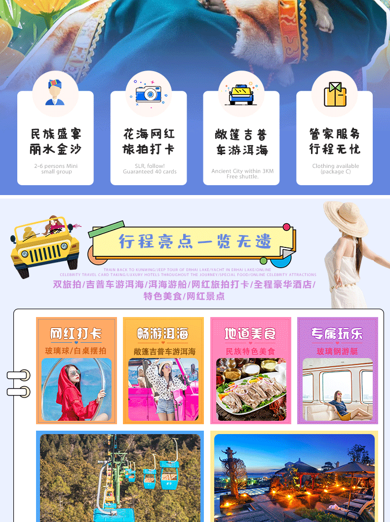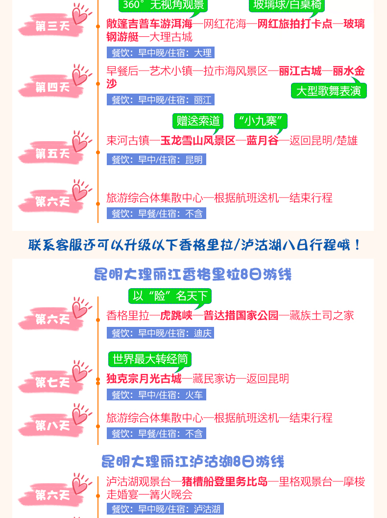 因云南属于经济落后地区,酒店住宿标准较低,请勿与内陆发达城市相比,如遇政府接待或其它特殊原因,不能安排参考酒店时,我社安排其他同价格级酒店。餐食行程中所列餐食,包含12餐:5早餐,4午餐,3晚餐