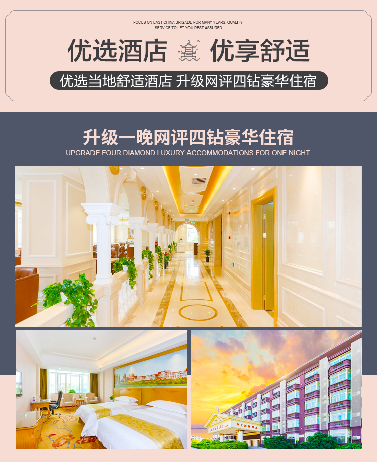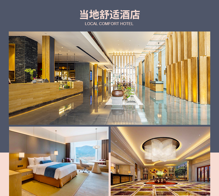 ⑤本线路安排酒店含次日丰盛自助早餐,酒店等级为携程旅行网评定的4钻级别酒店,因越来越多酒店不参与酒店评级,虽行程中有四星高档字样并不代表挂牌4星酒店,但是携程网评定相对权.威故按此钻级采购酒店,酒店都很高档舒适卫生请放心,行程所列参考酒店为通常我社安排入住的酒店,如遇参考酒店团队房满则安排其他同级酒店;