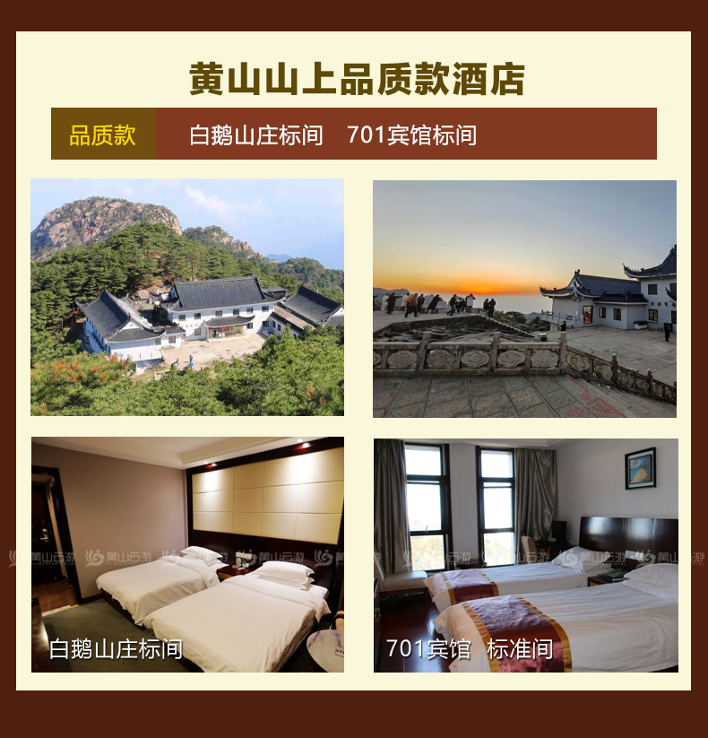 【品质款酒店】市区酒店2晚(黄山广交大酒店高级房或新安山庄园林酒店)山顶酒店1晚(白鹅山庄双床房或701台双床房可洗澡)