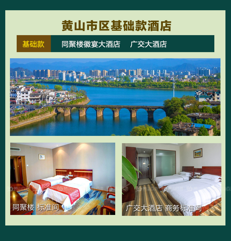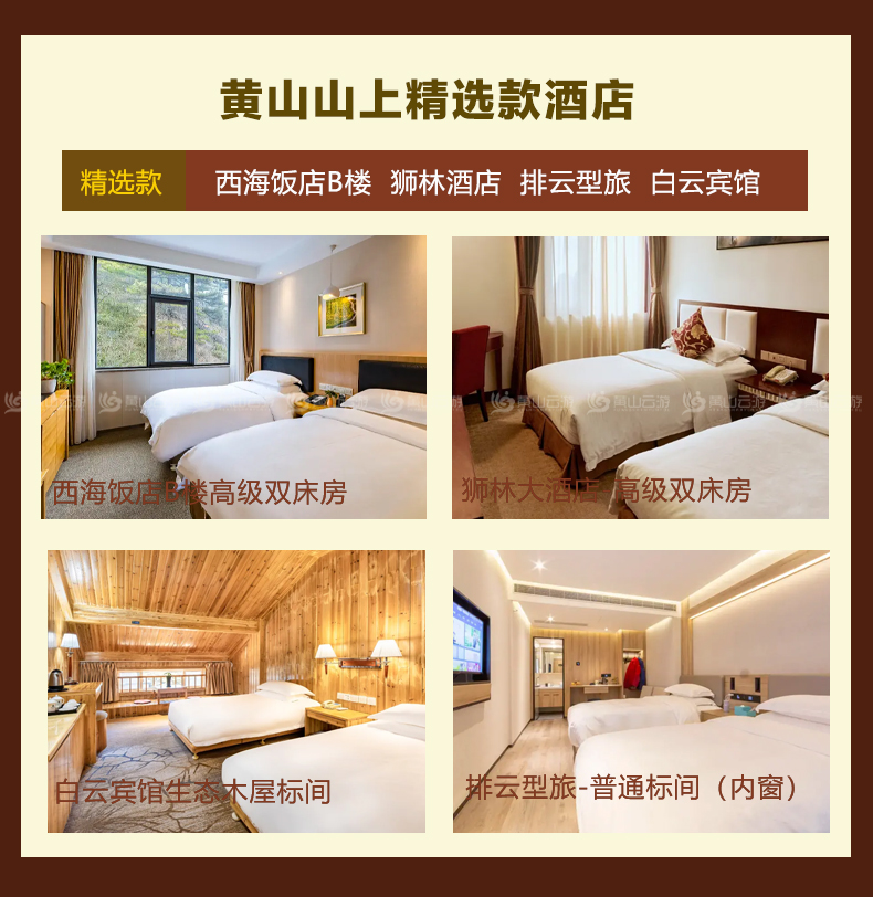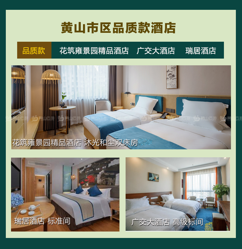 【优选款酒店】(全程4钻)市区酒店2晚(老街苑精品酒店或希诺屯溪老街店或瑞泰栢悦酒店)山顶酒店1晚参考(狮林大酒店高级标间或西海饭店B楼高级标间或白云宾馆生态木屋标间)