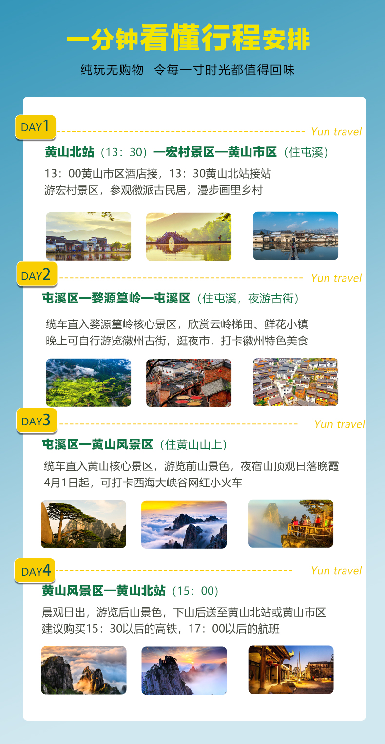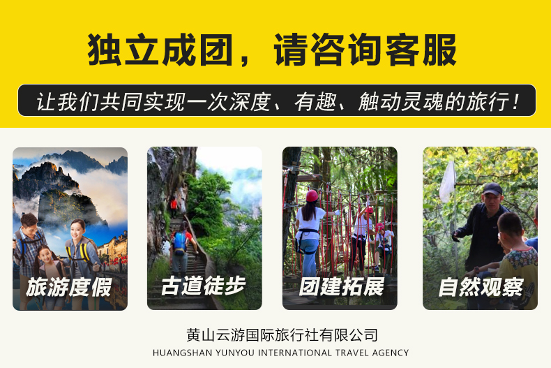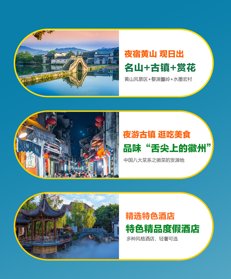 景点门票行程中所列景点首道大门票,黄山风景区大门票、上下景区交通车、宏村门票。篁岭门票、篁岭缆车当地交通根据参团人数调派车型,保证一人一正座住宿行程中所列酒店,此产品为单个成人的价格,只包含一张床位的费用。(单人入住需补床位差价)
