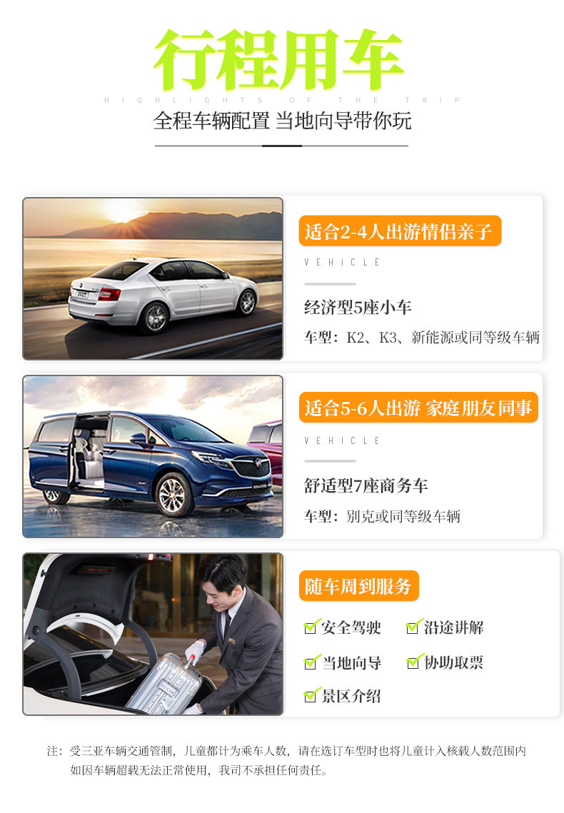 3.若出行中有(儿童、老人、学生、军人、伤残人士)等特殊人群,可先在线提交订单,客服会联系您确认相关优惠政策;