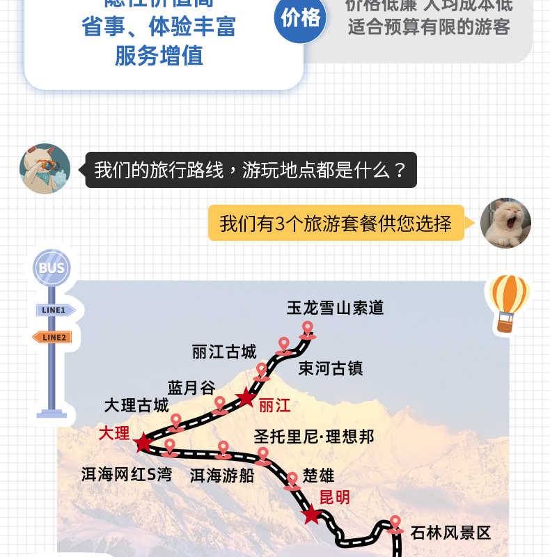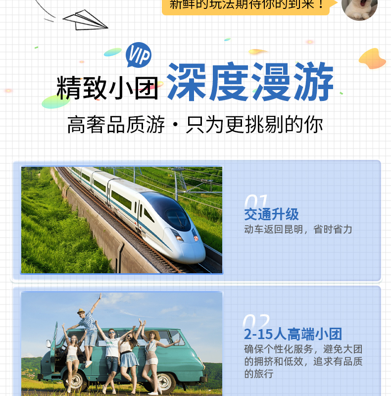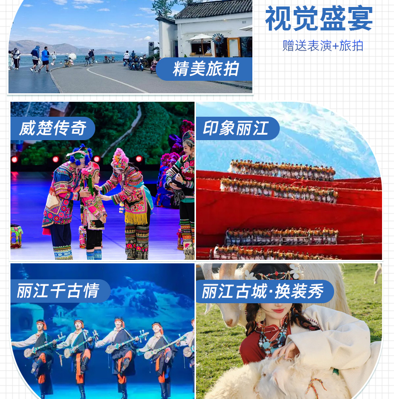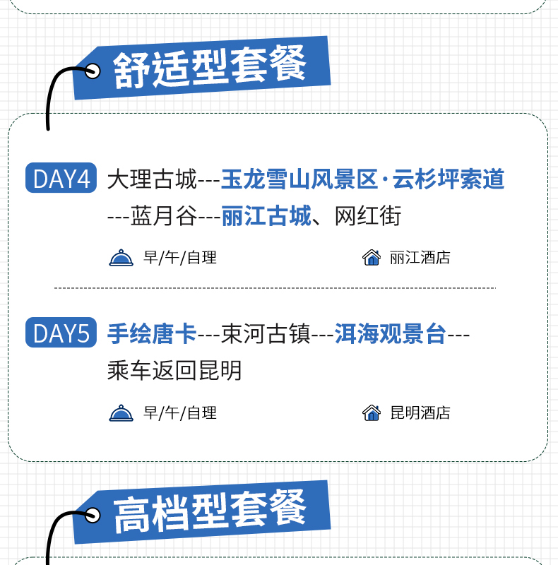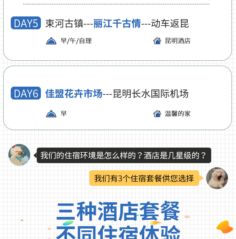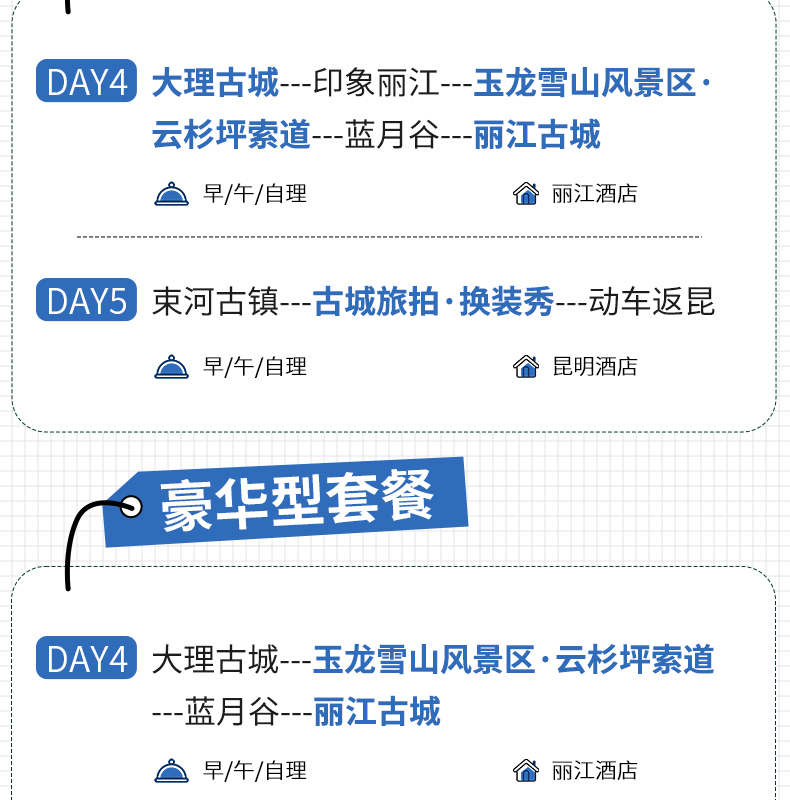 接送:昆明机场/高铁站接送服务住宿行程中所列酒店,5晚住宿费用,标准2人间,大床或三人间请联系客服安排,单人需补单房差。