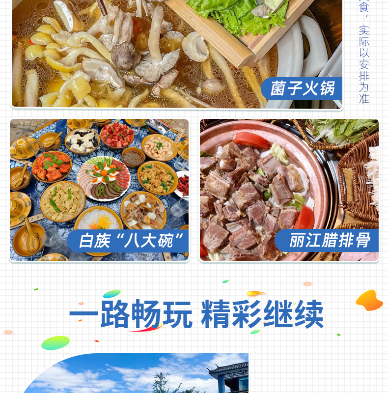 早餐酒店提供,全程安排云南民族特色风味餐,正餐十菜一汤,十人一桌,5早5正1餐包,正餐餐标30元/人。(如果客人自愿放弃用餐,餐费一律不予退还)