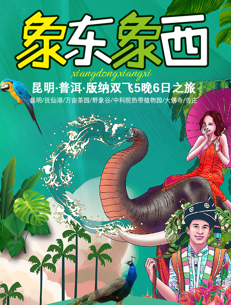 【趣游版纳】昆明+抚仙湖+西双版纳双飞6日游(抚仙湖+傣家村落过泼水节+野象谷看大象表演+中科院热带植物园+傣族特色孔雀宴)景点门票行程中所列景点首道大门票大交通飞机往返经济舱机票