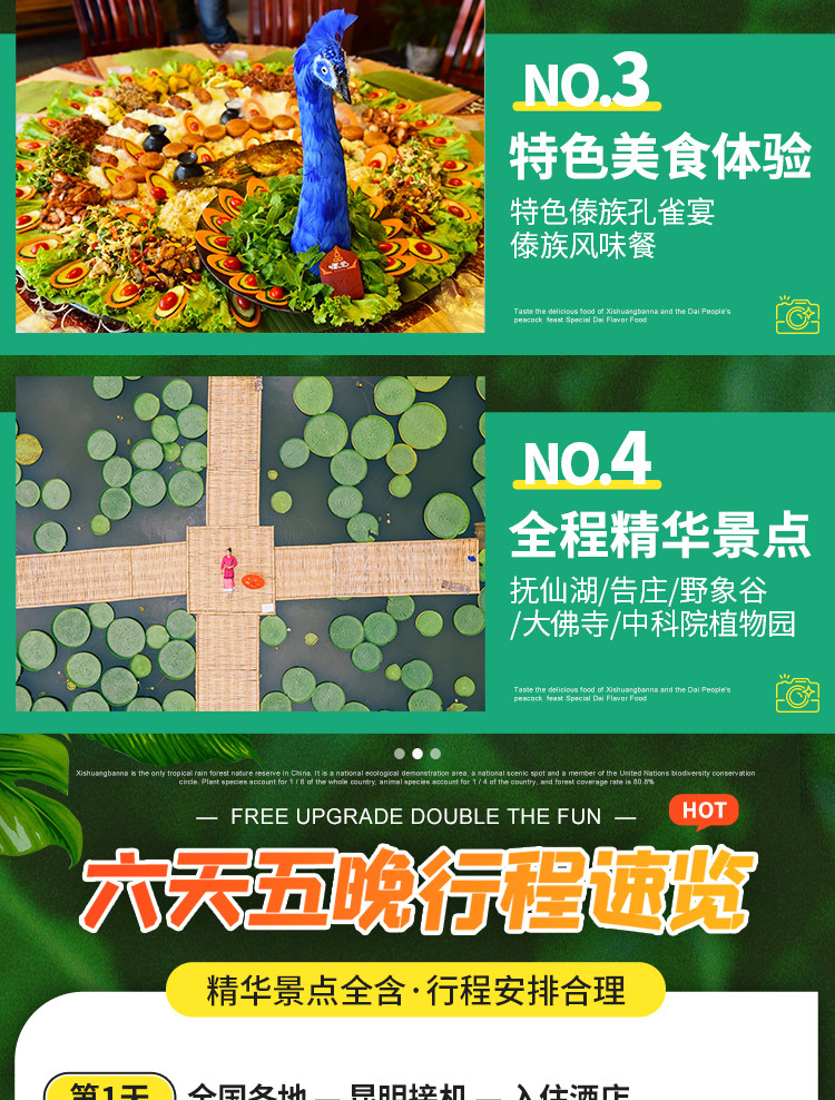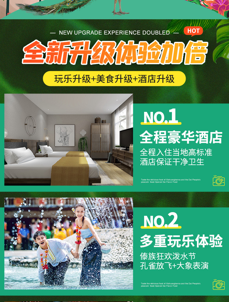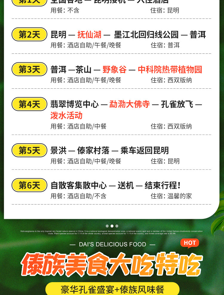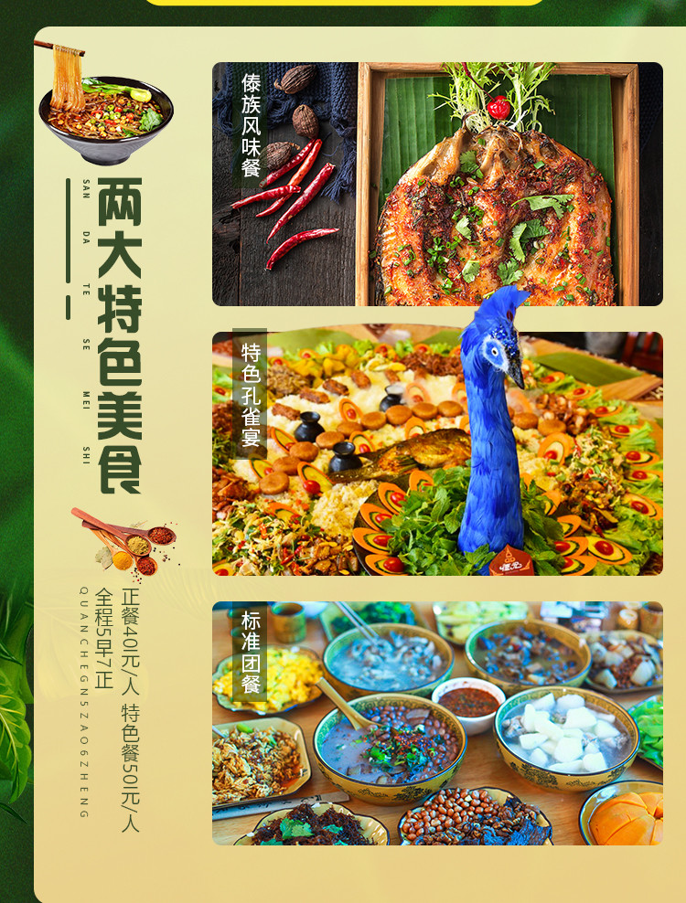 用餐标准:十人一桌,2个特色餐。用餐标准为—正餐30元/人,特色餐40元/人(傣族孔雀宴、傣族风味餐)。
