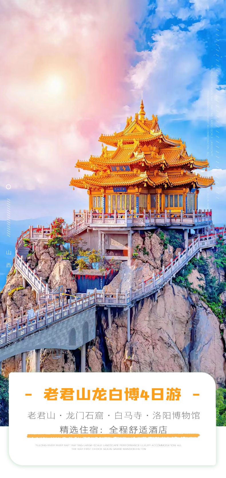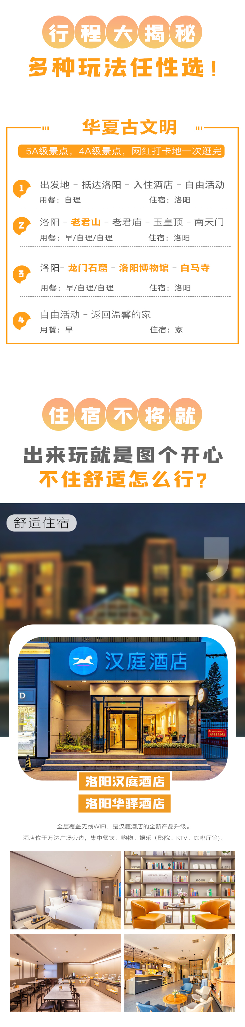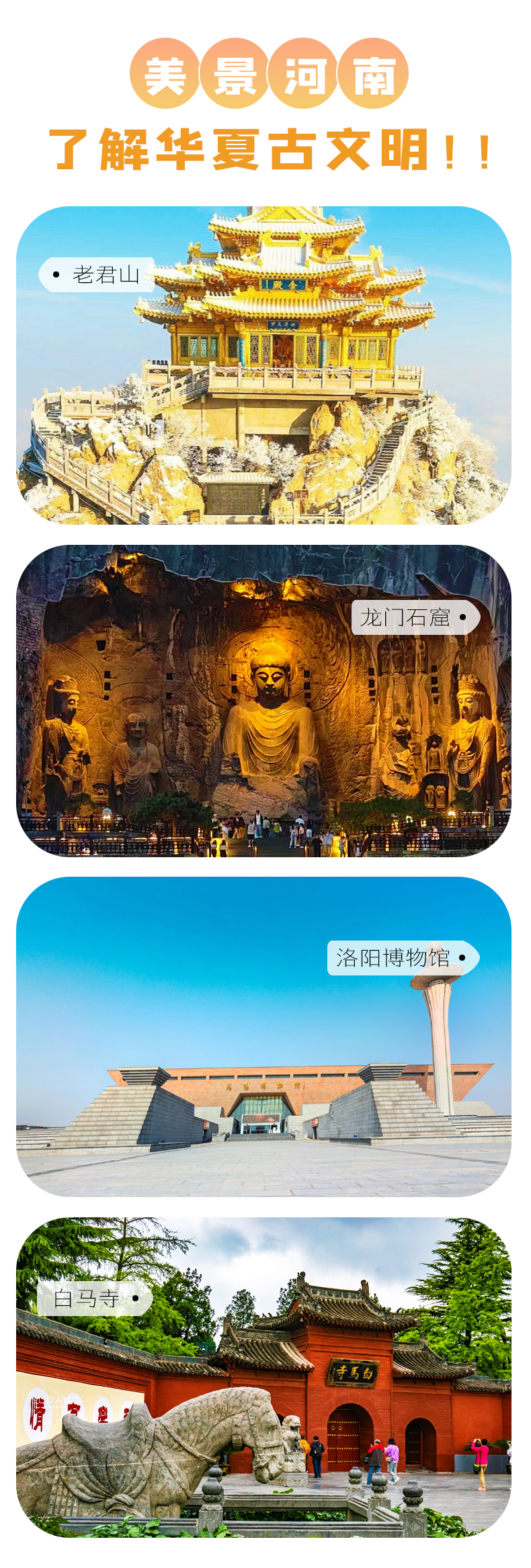 【纯玩无购物】河南洛阳4天3晚跟团游(全程精选酒店+栾川老君山+龙门石窟+洛阳博物馆+白马寺)景点门票行程中所列景点首道大门票大交通火车往返二等座