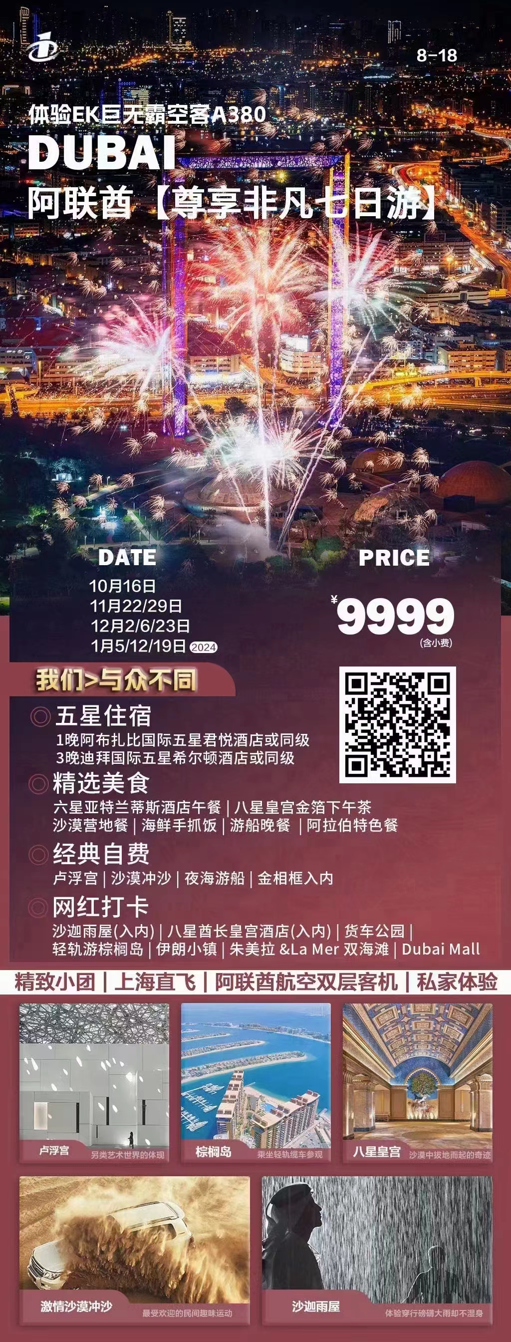 迪拜-上海 参考航班 EK302 0310-1505 飞行时间 8h55m(以出团通知书为准) 回到上海,结束愉快的阿联酋之旅。