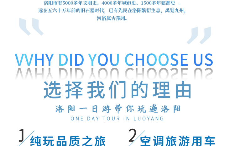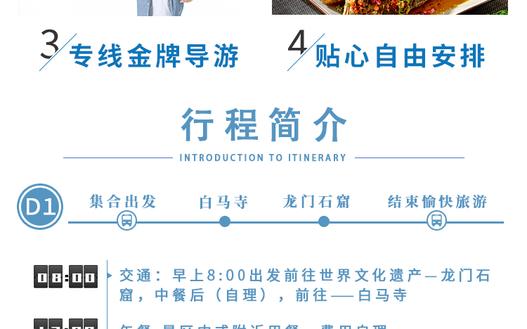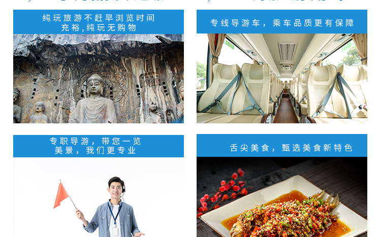 17:00-18:00 集合返回古都洛阳 结束愉快的行程! 上述行程及时间仅供参考,具体以导游现场实际安排为准;如遇特殊情况,我社有权在不减少景点的情况下,对游览顺序作相应调整,以确保行程顺利进行,敬请理解。